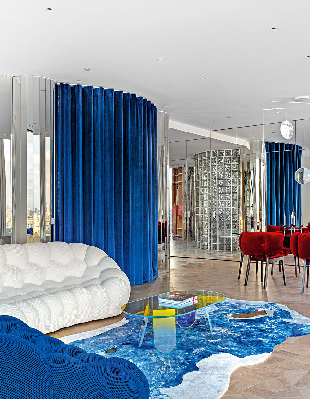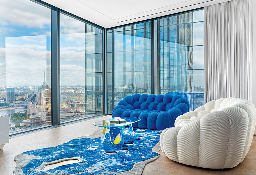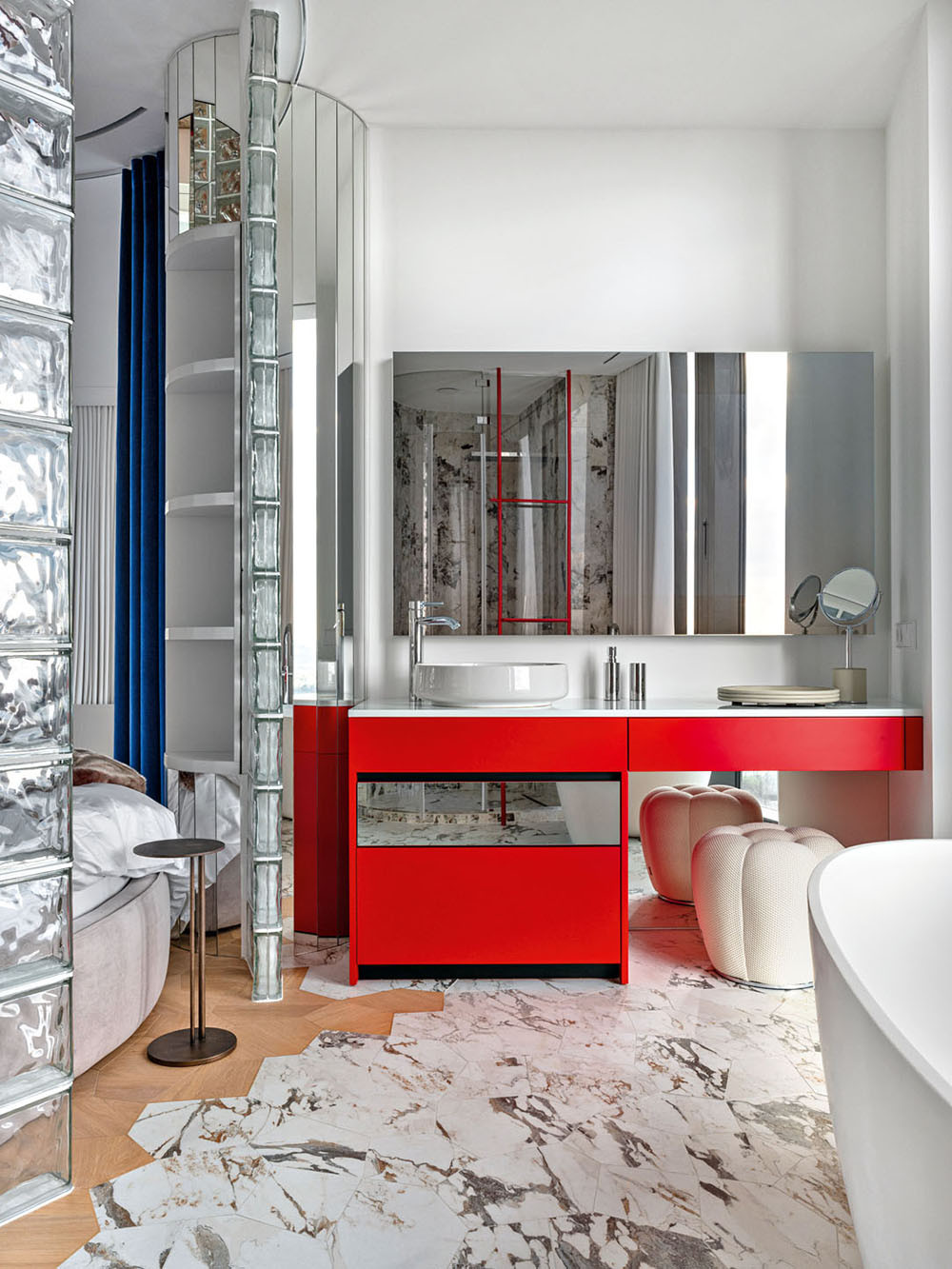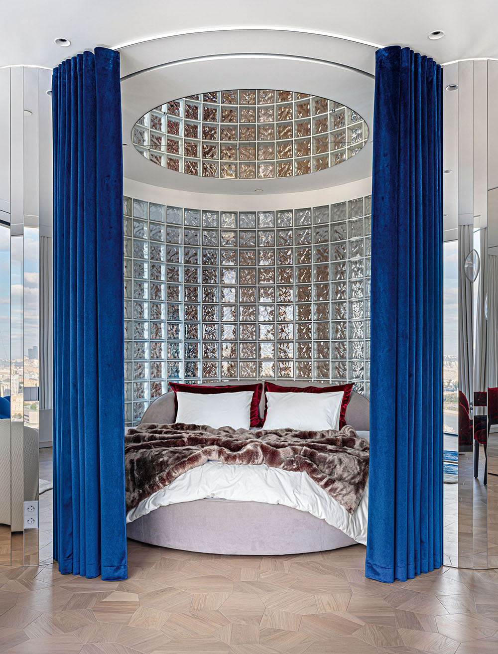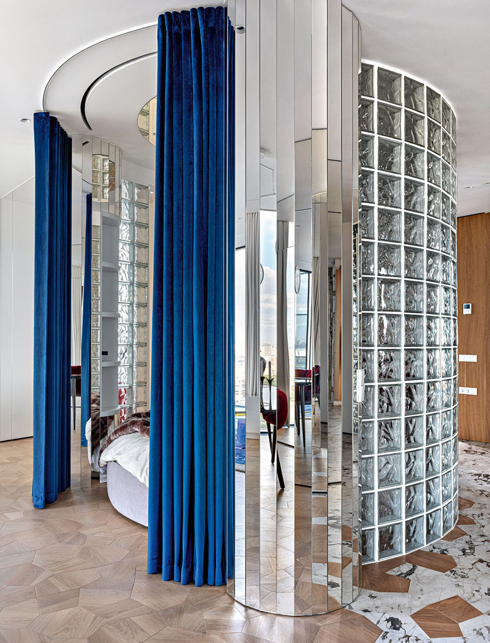 Неожиданное решение кроется уже в планировке. В квартире нет ни единой стены, если не считать радиусную перегородку, обрамляющую кровать. Помещения свободно перетекают одно в другое, без четкого деления на функциональные зоны. В сочетании с окнами в пол, из которых открывается невероятный вид на Москву, этот прием создает ощущение легкости и простора. Глянцевые фасады мебели и зеркальные стеновые панели «впускают» городскую панораму в интерьер, делая ее полноправной частью общего замысла. Еще одна особенность оформления — мягкие, скругленные формы мебели. Даже кровать в зоне спальни круглой формы, не говоря уже о коврах, столиках и светильниках. «Воплощать идеи заказчиков, даже самые необычные, для меня сплошное удовольствие, — продолжает Ирина Чернейкина. — Заказчица сразу обозначила, что не любит острые углы, на это мы и ориентировались при подборе мебели и декора. Еще одним пожеланием было добавить отсылки к советскому времени — так в проекте появились модульные полы из паркетной доски, которая плавно перетекает в керамогранит, и перегородка из стеклоблоков».
