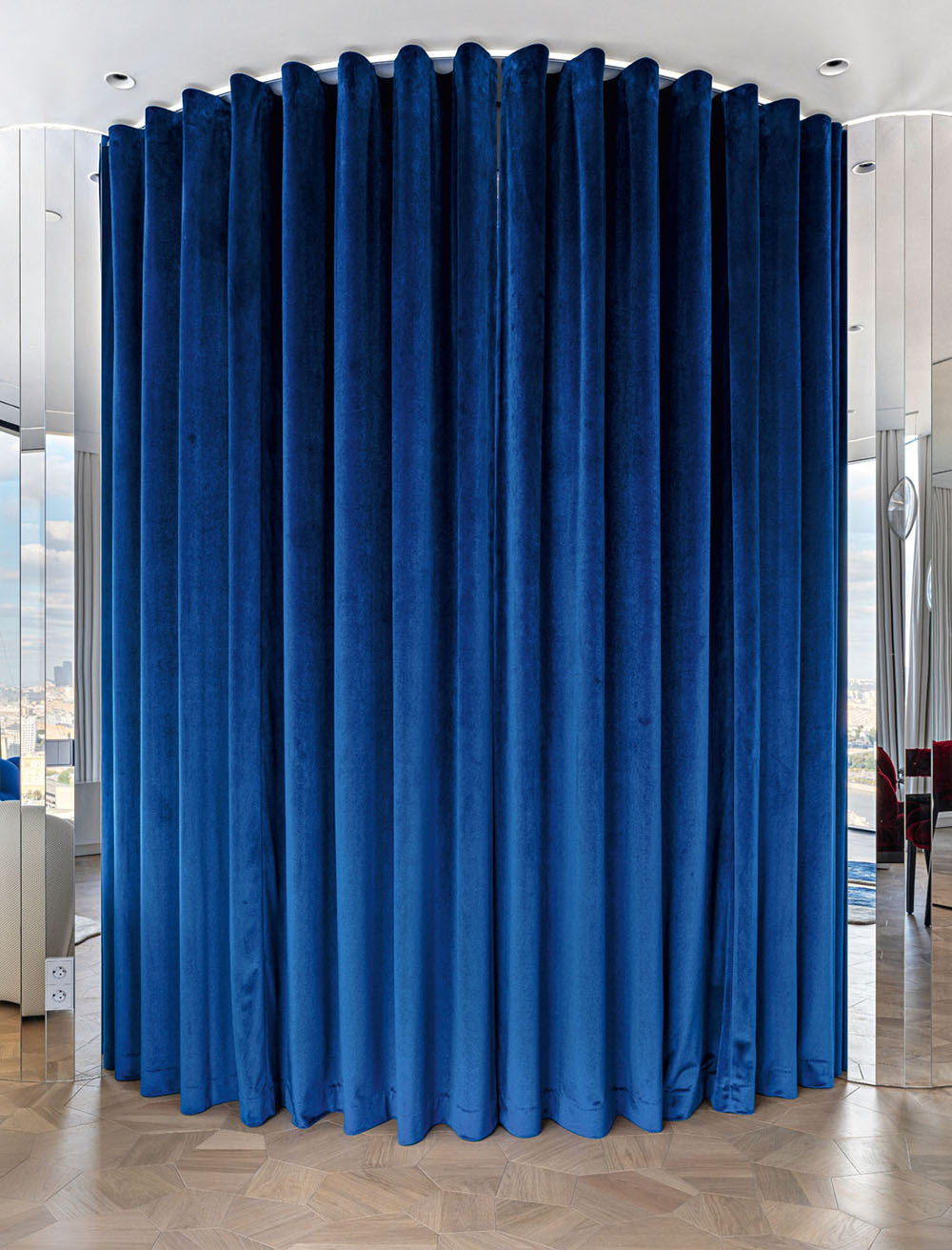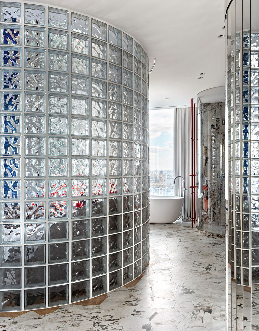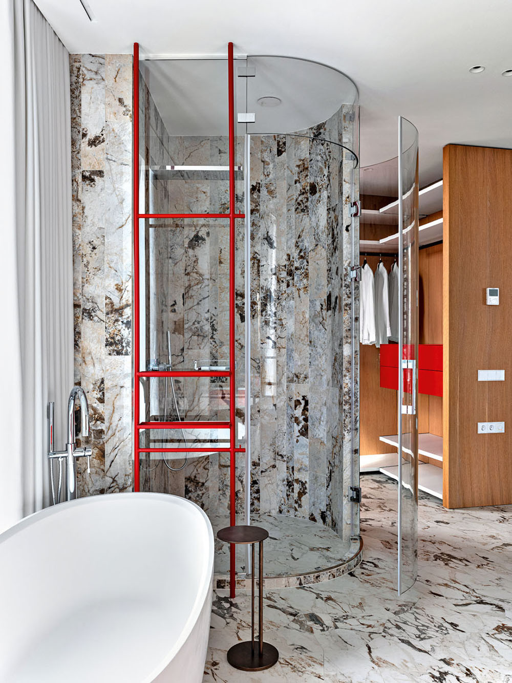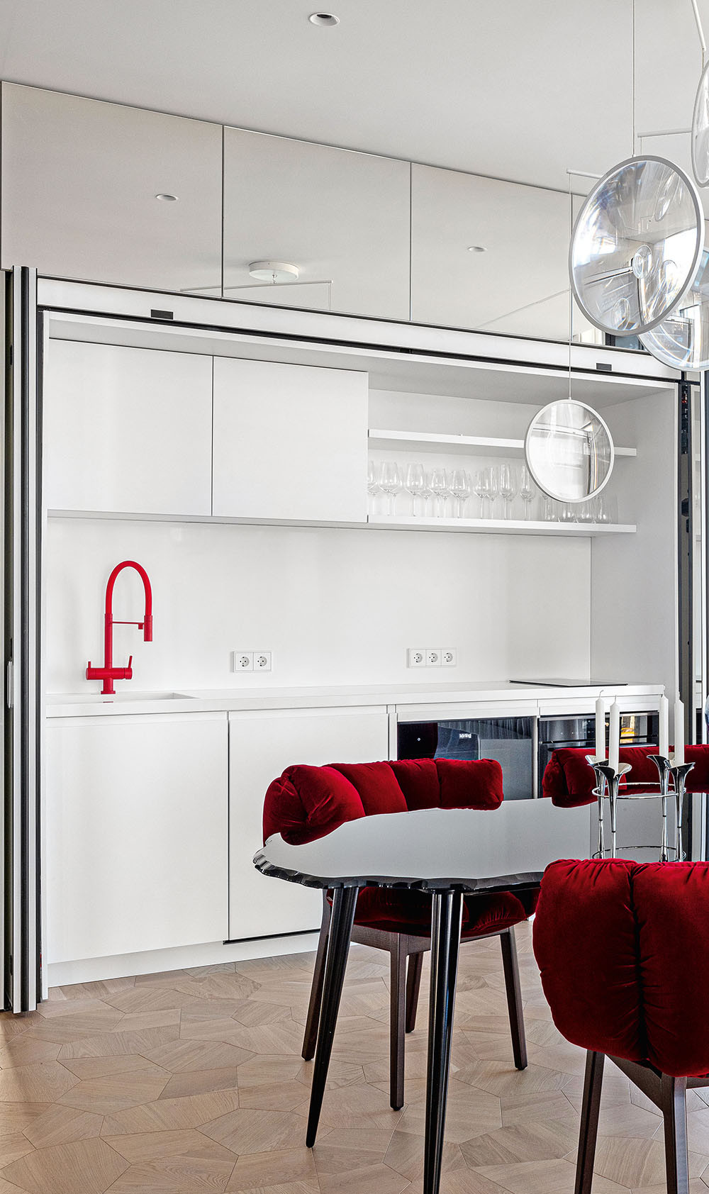 Неожиданное решение кроется уже в планировке. В квартире нет ни единой стены, если не считать радиусную перегородку, обрамляющую кровать. Помещения свободно перетекают одно в другое, без четкого деления на функциональные зоны. В сочетании с окнами в пол, из которых открывается невероятный вид на Москву, этот прием создает ощущение легкости и простора. Глянцевые фасады мебели и зеркальные стеновые панели «впускают» городскую панораму в интерьер, делая ее полноправной частью общего замысла. Еще одна особенность оформления — мягкие, скругленные формы мебели. Даже кровать в зоне спальни круглой формы, не говоря уже о коврах, столиках и светильниках. «Воплощать идеи заказчиков, даже самые необычные, для меня сплошное удовольствие, — продолжает Ирина Чернейкина. — Заказчица сразу обозначила, что не любит острые углы, на это мы и ориентировались при подборе мебели и декора. Еще одним пожеланием было добавить отсылки к советскому времени — так в проекте появились модульные полы из паркетной доски, которая плавно перетекает в керамогранит, и перегородка из стеклоблоков».