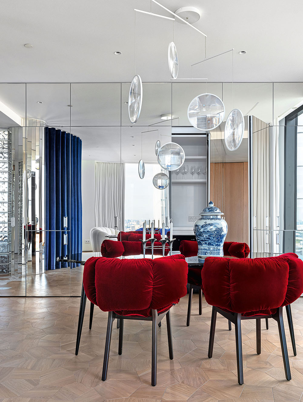 Это интерьер-игра, интерьер-фантазия, свободный от условностей и шаблонов. На этот эффект работает и выбор мебели. В зоне гостиной солируют диваны Bubble от французского бренда Roche Bobois: их необычная форма, напоминающая облако или морской коралл, поддерживает игривый и непринужденный характер пространства. А люстра от DCW над обеденным столом — кокетливый намек на мобиль из советского фильма «Служебный роман». «В последнее время заказчики отходят от минимализма в интерьере с его «бежевой картинкой», — завершает рассказ Ирина. — Растет спрос на индивидуальные решения, дизайн «с перчинкой» и своим характером. Возвращается и запрос на насыщенную, живую палитру. Этот проект — еще один пример того, как жилое пространство может отразить личность владельца, его энергию и харизму».