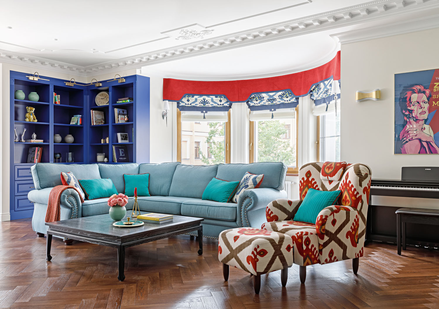 Квартира находится в новом доме в центре Санкт–Петербурга, в жилом комплексе «Русский дом». Этот яркий эклектичный интерьер отлично вписался в контекст Северной столицы: «Сюда по новым им волнам все флаги в гости будут к нам» (А.С. Пушкин, «Медный всадник»). И действительно, в этом пространстве объединились и западноевропейские мостивы, и ближневосточные, и юго–восточные. Элементы неоклассики, шинуазри, ар–деко, mid–century, колониального стиля и поп–арта органично сосуществуют в энергичном миксе. А начинался этот интерьер с портрета Дэвида Боуи в духе поп–арта и марокканской люстры, которые уже были у владельцев квартиры. Эти два предмета хозяева хотели видеть в своём интерьере, и они, как два полюса, задали широту интерьерной теме. Сейчас постер с Боуи украшает гостиную, а люстра — хаммам.