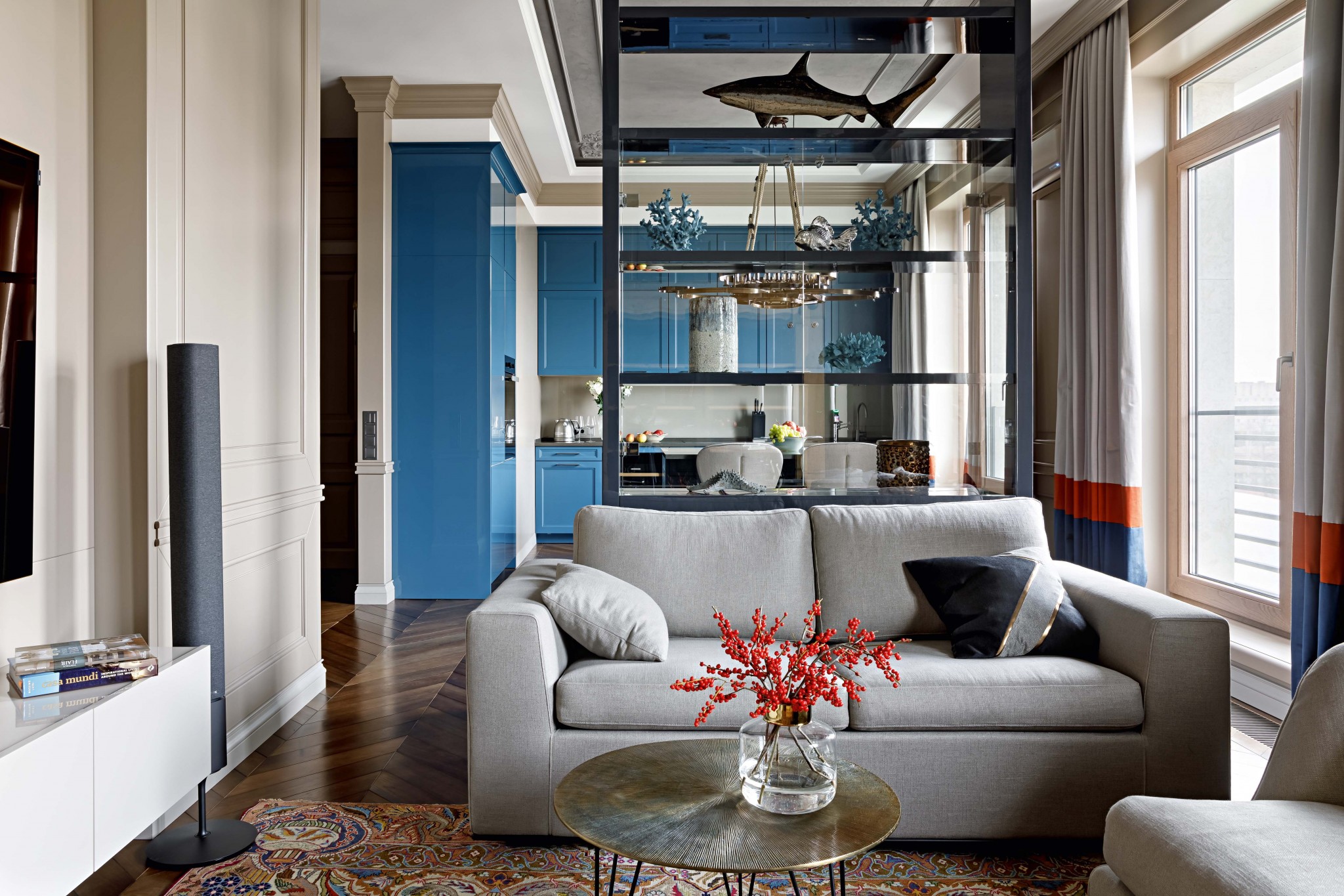 «Исходных требований у заказчика было немного, — вспоминает Алина Лавренченко. — Поскольку он не любит белый цвет, мы окрасили потолки, карнизы и панели в серо–бежевые оттенки. В то же время он очень хотел, чтобы в интерьере были бетон и натуральное дерево — его любимые материалы. Так появились бетонный потолок в гостиной–кухне и фактурная стеновая панель в спальне. Яркий, неординарный характер владельца и его главное пожелание, чтобы интерьер кардинально отличался от того, в котором он раньше жил, — всё это открыло дорогу экспериментам. Одним из них стала цветная кухня. Насыщенный синий великолепно сочетается с серо–бежевыми тонами, преобладающими в интерьере, и в то же время насыщает его яркими и энергичными красками. Использование такого большого объёма цвета — довольно смелое решение, ведь чуть– чуть не тот тон, и он испортил бы всю картину. Мы потратили много времени в поисках идеального оттенка, сделали множество выкрасов, пока не добились нужного результата».