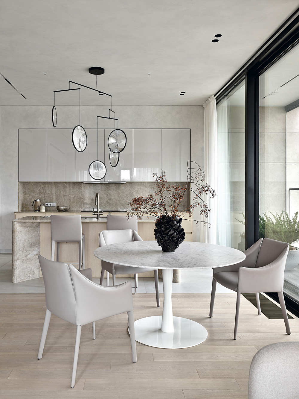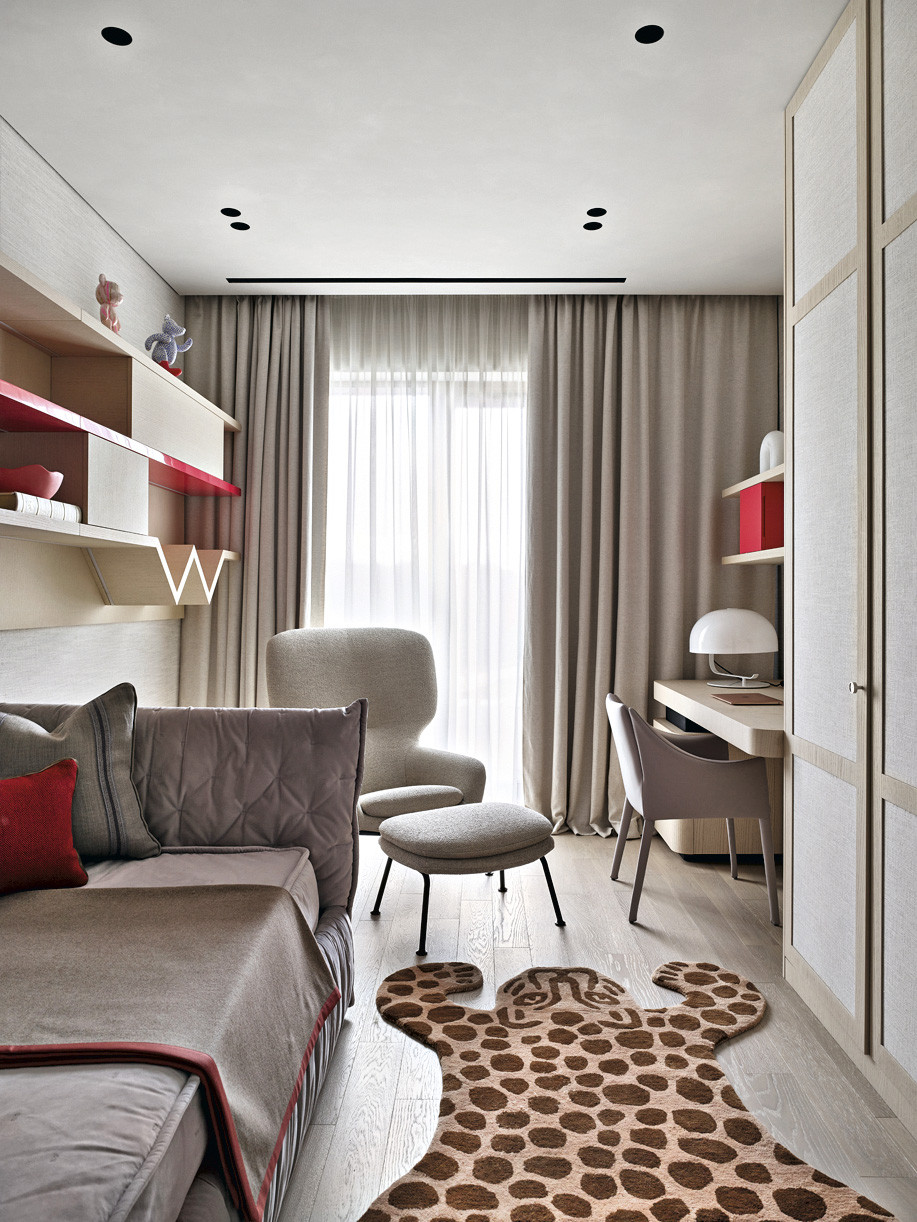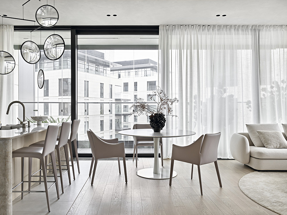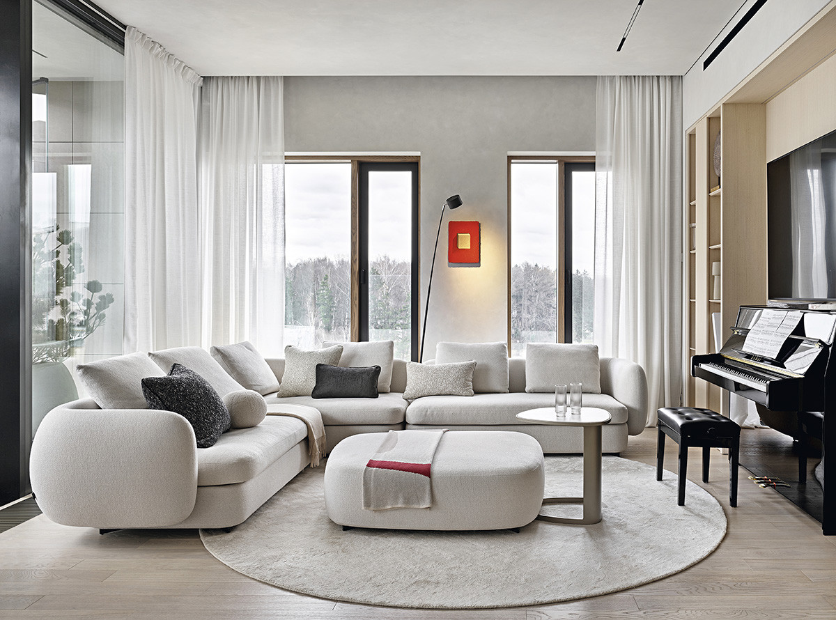 У интерьера интересная предыстория: заказчики попросили архитекторов создать здесь идеальное пространство для коллекции произведении искусства. Так в интерьере появились светло-серый, как в галерее, оттенок стен и потолка, скульптурные формы дизайнерской мебели со скругленными углами, эффектная подсветка. И всё вместе это участвует в создании атмосферы тишины и гармонии, где искусство выходит на первый план. Но эстетика не отменяла задач функционального зонирования, поэтому авторы проекта разделили пространство на зоны кухни-гостиной, главной спальни с гардеробной и ванной комнатой, детской, кабинета, входную и постирочную. Преимущества квартиры — панорамный вид на город и большая лоджия рядом с гостиной. На лоджии решили создать зимний сад, и теперь природа словно стирает границы между интерьером и городом, а открытое, перетекающее пространство кухни-гостиной кажется еще просторнее.