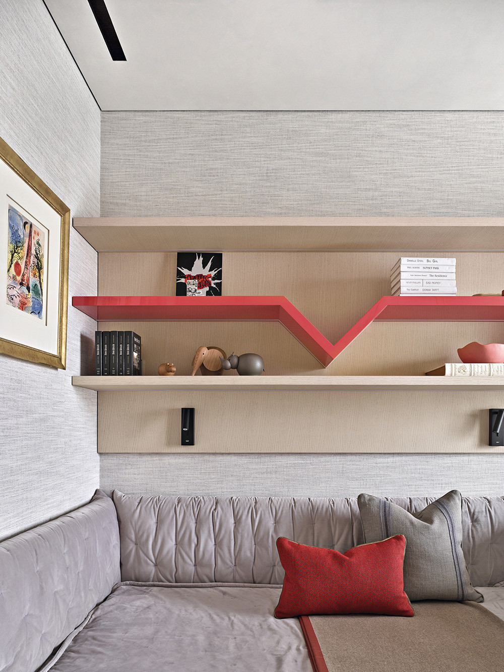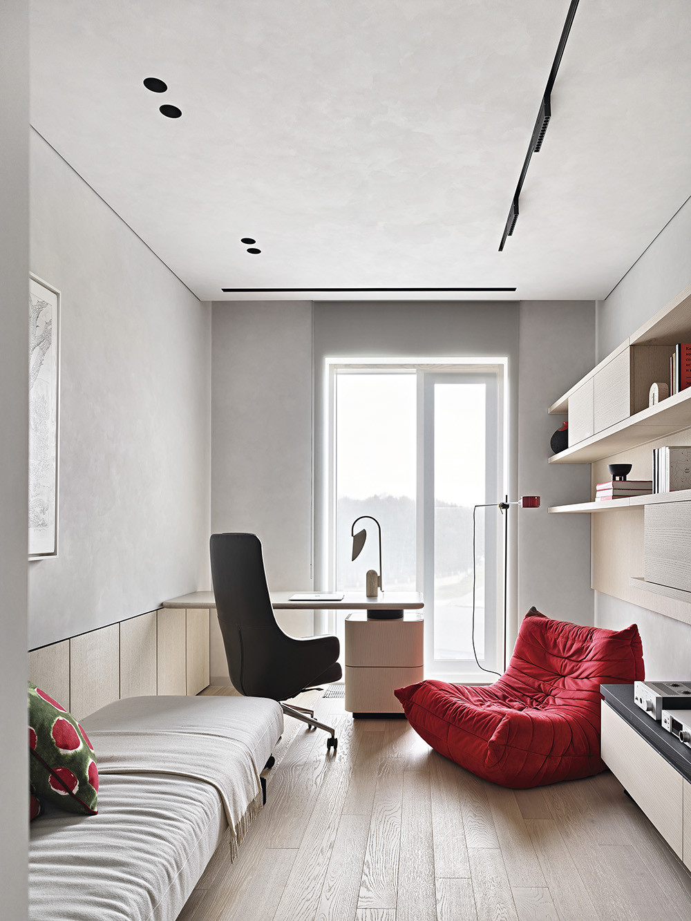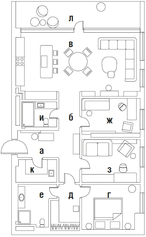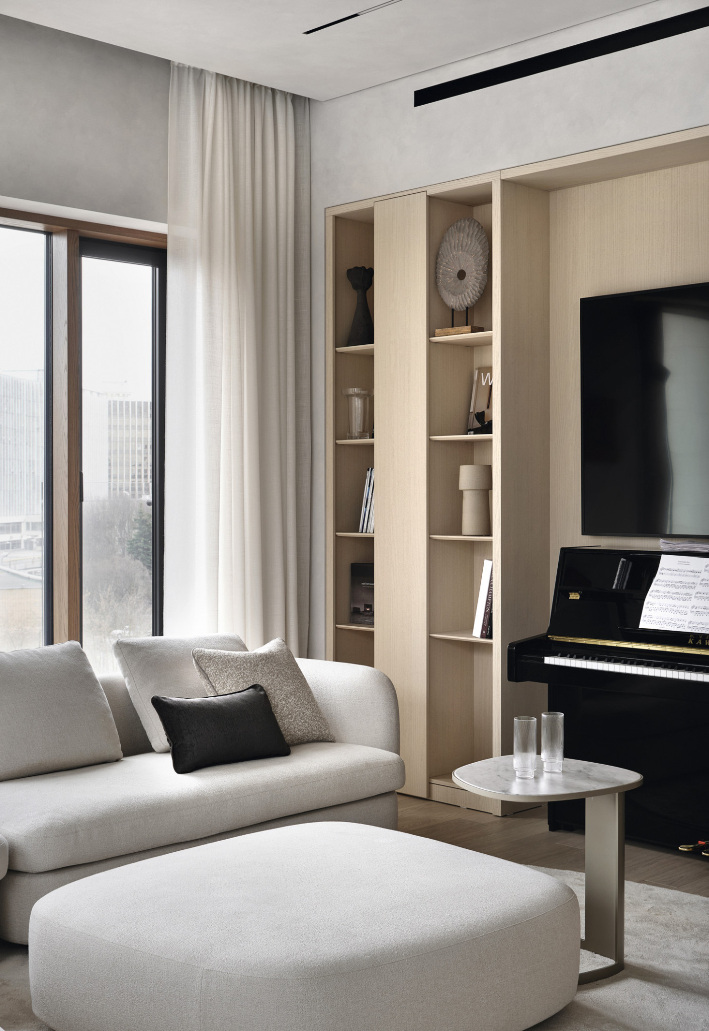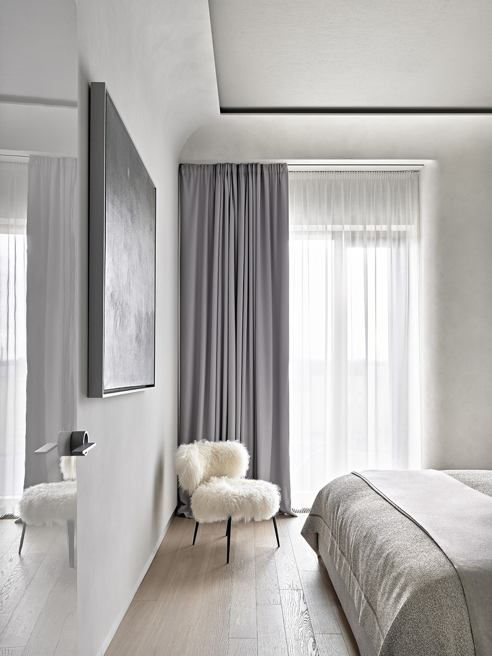 У интерьера интересная предыстория: заказчики попросили архитекторов создать здесь идеальное пространство для коллекции произведении искусства. Так в интерьере появились светло-серый, как в галерее, оттенок стен и потолка, скульптурные формы дизайнерской мебели со скругленными углами, эффектная подсветка. И всё вместе это участвует в создании атмосферы тишины и гармонии, где искусство выходит на первый план. Но эстетика не отменяла задач функционального зонирования, поэтому авторы проекта разделили пространство на зоны кухни-гостиной, главной спальни с гардеробной и ванной комнатой, детской, кабинета, входную и постирочную. Преимущества квартиры — панорамный вид на город и большая лоджия рядом с гостиной. На лоджии решили создать зимний сад, и теперь природа словно стирает границы между интерьером и городом, а открытое, перетекающее пространство кухни-гостиной кажется еще просторнее.