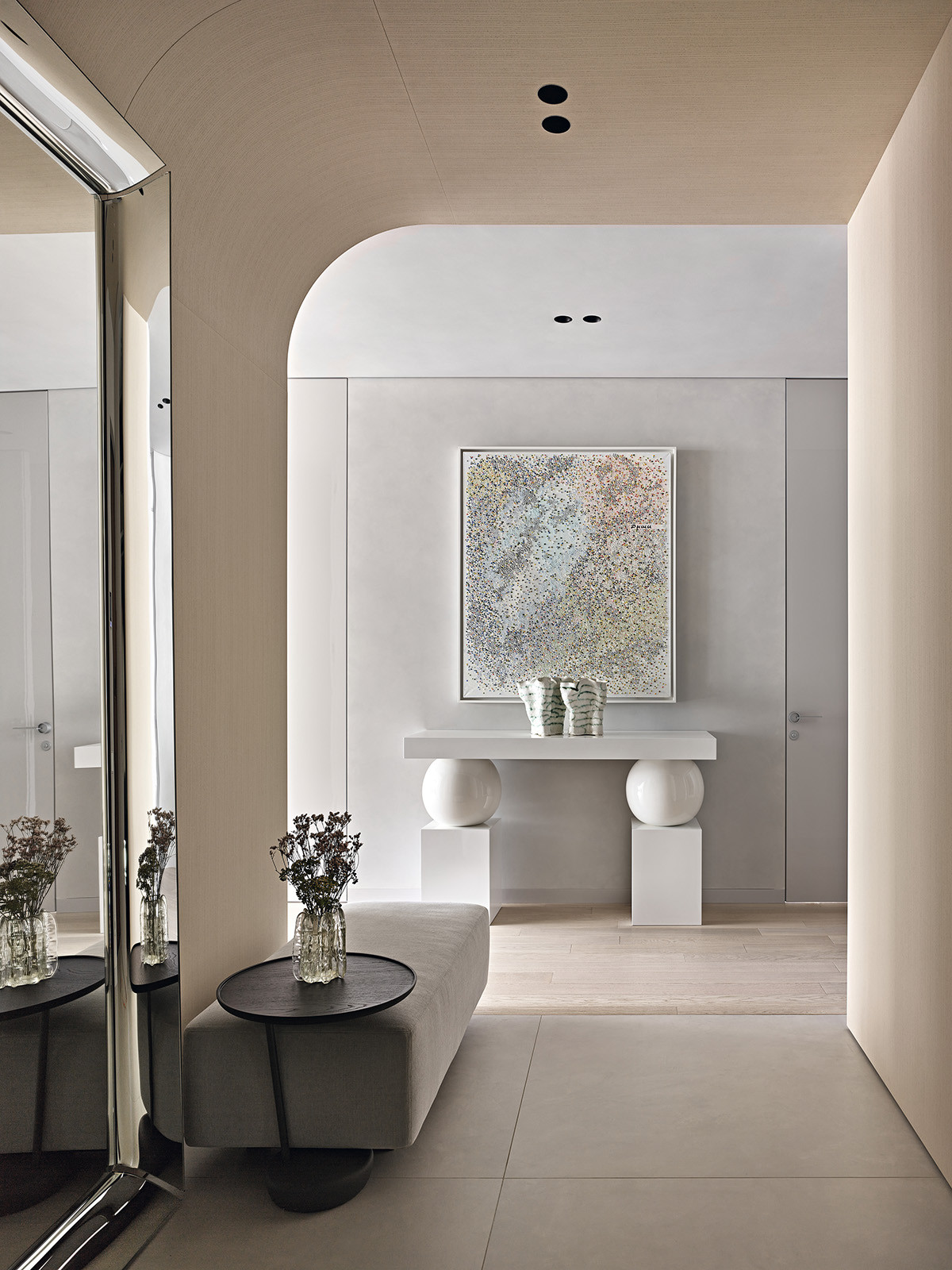Кажется, что интерьер сделан легко, на одном дыхании. Однако, как признаются его авторы, он был сложным в реализации: в пространстве использованы теневые профили, утопленные плинтусы, высокие двери в потолок, кроме того, осуществлена стыковка разных отделок в один уровень. Но эта квартира — не просто «каталог» технических приемов, а настоящее произведение искусства. Так, достичь идеально ровных и тонких швов невероятно сложно: это требует ювелирной работы профессионалов, точного расчета и подгонки. Зато результат того стоит: здесь есть ощущение безупречной чистоты линий. Двери в потолок — не просто элегантный компонент пространства, а еще «игра на вертикали»: двери визуально увеличивают высоту помещения и создают ощущение еще большей свободы. Кроме того, они добавляют графичности и строгости интерьеру, работают на контрасте с женственными формами мебели.
