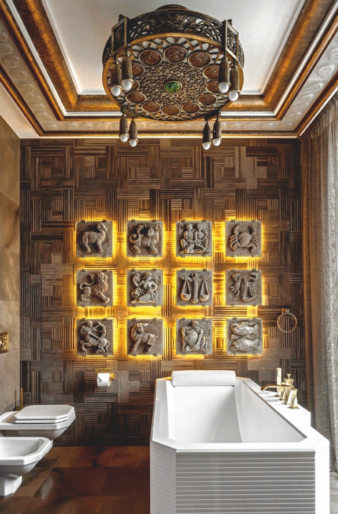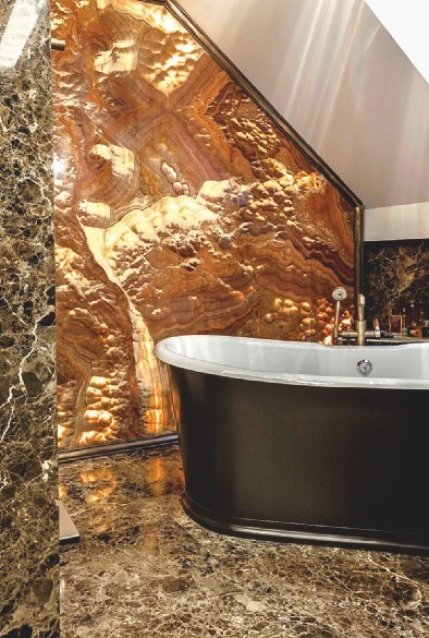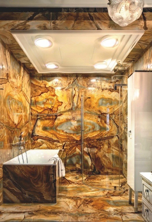Отдельного внимания заслуживает работа с камнем. Первое, что видит входящий в квартиру человек, — «мраморную» реку, прихотливо извивающуюся и увлекающую дальше, вглубь квартиры. «Динамичный рисунок при‑ родных жил и правда напоминает речной поток, — поясняет Павел. — Выложив пол этим красивым камнем, мы акцентировали направление, куда двигаться, задали движение в интерьере — от прихожей в сторону общественной зоны». Прихожей дело не ограничилось. Мрамором и ониксом удивительной красоты отделали ванные комнаты и гостевой санузел. Для каждого помещения подбирался свой камень и цвет. К примеру, одна половина ванной комнаты дочери облицована золотистым мрамором с разводами, напоминающим то ли марсианский пейзаж, то ли извергающуюся лаву, другая — чёрным мрамором с вкраплениями, вызывающим ассоциации с распиленной галькой. Архитектор и заказчики специально ездили за камнем в Италию, выбирали на месте те или иные слэбы, в некоторые влюбились с первого взгляда. «Натуральный камень — это, в первую очередь, очень живой материал, тёплый, — поясняет Павел. — Он даёт эмоции, заряжает энергией, ни какая плитка не в состоянии создать такое ощущение. Это как живая картина, которой можно бесконечно любоваться».