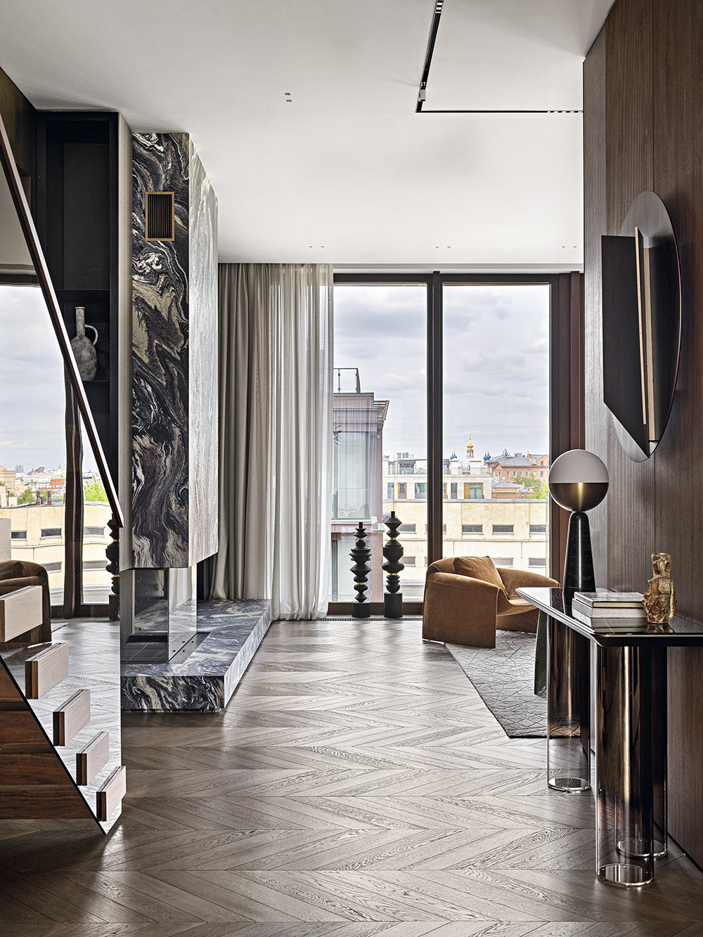 Архитектор Нино Зварковская оформила квартиру в московском пентхаусе для молодой семьи: проект с нестандартной планировкой и смелыми сочетаниями фактур