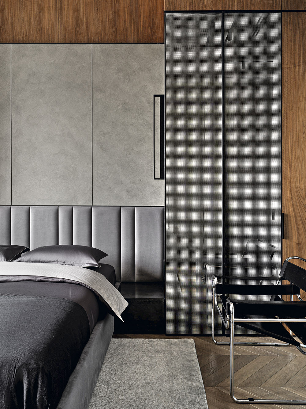 Детские получились абсолютно разными — у каждой из двух комнат свой неповторимый характер, свое лицо. «Дети уже достаточно взрослые, и на этапе проектирования они четко понимали, что им нужно. Парадокс, но подростки даже лучше и четче сформулировали нам задачу, чем взрослые», — подчеркивает автор. Комната сына предельно эргономична — особенное внимание уделено удобству рабочего пространства: розеткам, проводам, сценариям освещения. Здесь царит строгая атмосфера, сотканная из многослойных фактур с нотками лофта. Например, специально для этой комнаты разработали фасады для шкафов с металлической сеткой, за которыми скрываются зеркала.