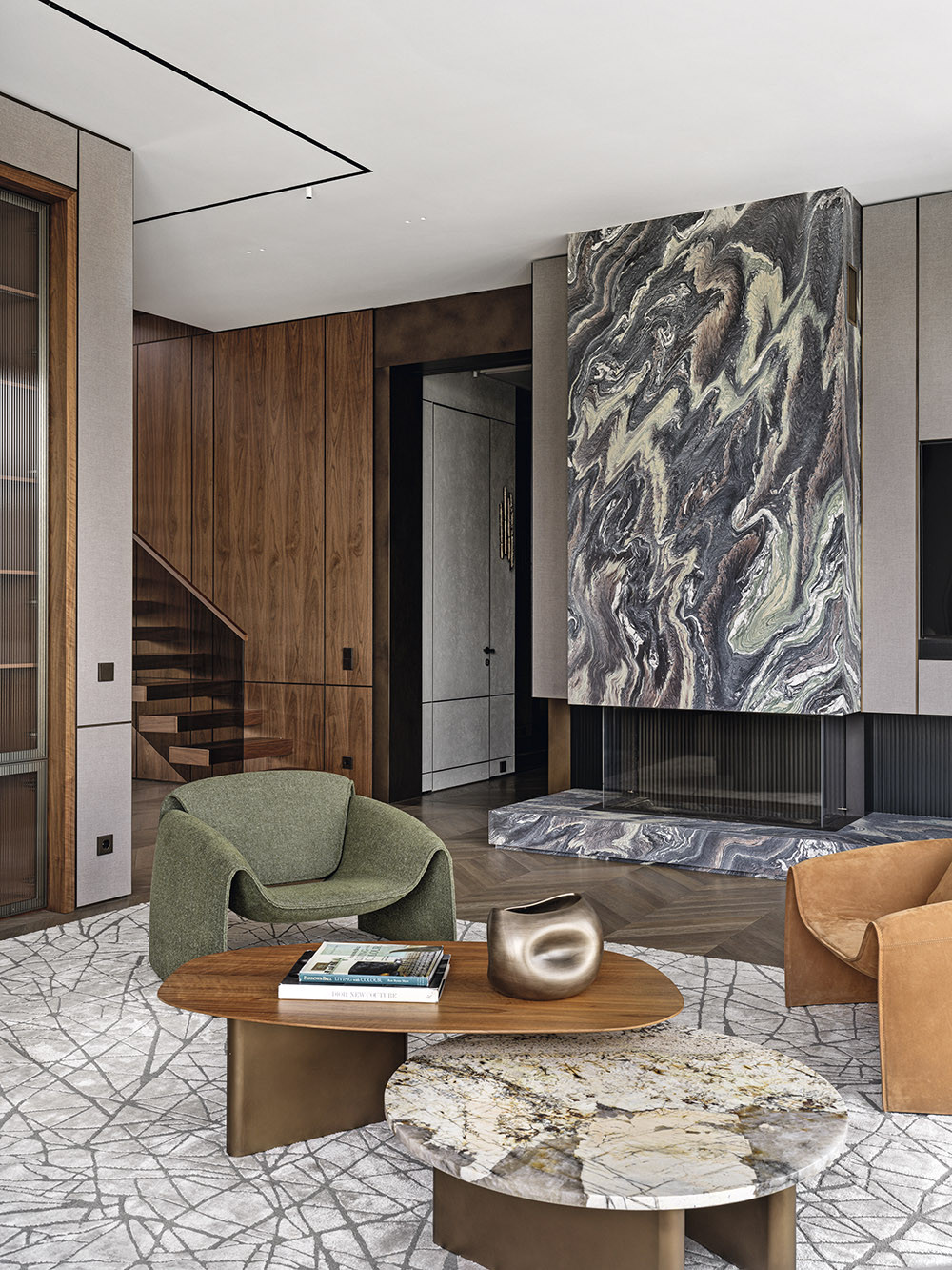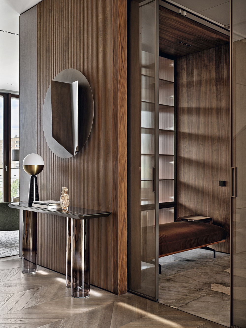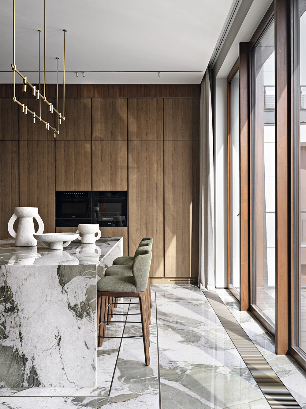 Многие решения продиктованы планировкой. В результате объединения квартир появился очень длинный холл, который соединил гостевую и приватную зоны. Нино Зварковская решила сделать этот недостаток «изюминкой» интерьера: здесь асимметрично разместили зеркала, а чтобы впустить в коридор естественный свет, его отделили от гостиной стеклянной перегородкой Rimadesio. Заключительным штрихом служит скульптура на пьедестале в холле, которая силуэтом просматривается из гостиной. Тот же прием применили в прихожей. Квартира имеет панорамное остекление, и автору проекта хотелось, чтобы солнце проникало и сюда. Одна из стен частично превратилась в нишу — только шкаф из рифленого стекла отделяет прихожую от гостиной. Непредсказуемая игра света каждый раз вдыхает новую жизнь в изначально монотонное пространство. Заказчик очень любит натуральные материалы и текстуры, и по его запросу в гостиной появился выразительный мрамор Cipollino с узором, напоминающим слои луковицы. Облицованный им камин стал отправной точкой для всего интерьера комнаты. Кварцит Patagonia объединяет прихожую с пространством гостевого санузла. Остров в кухне-столовой выполнен из другого вида кварцита — Moon Ray: его зеленоватый узор, похожий на крупные листья, отсылает к «природной» теме и перекликается с серо-зеленой мебелью.