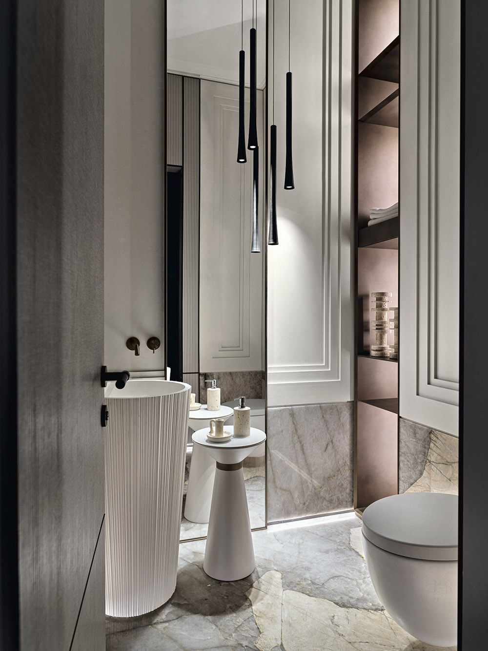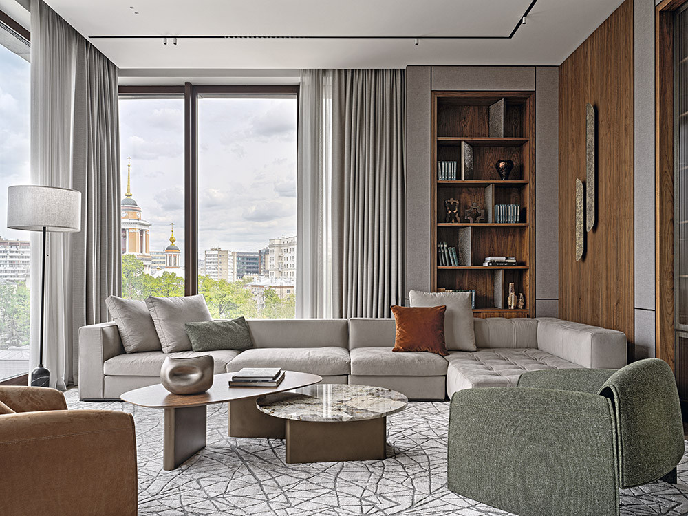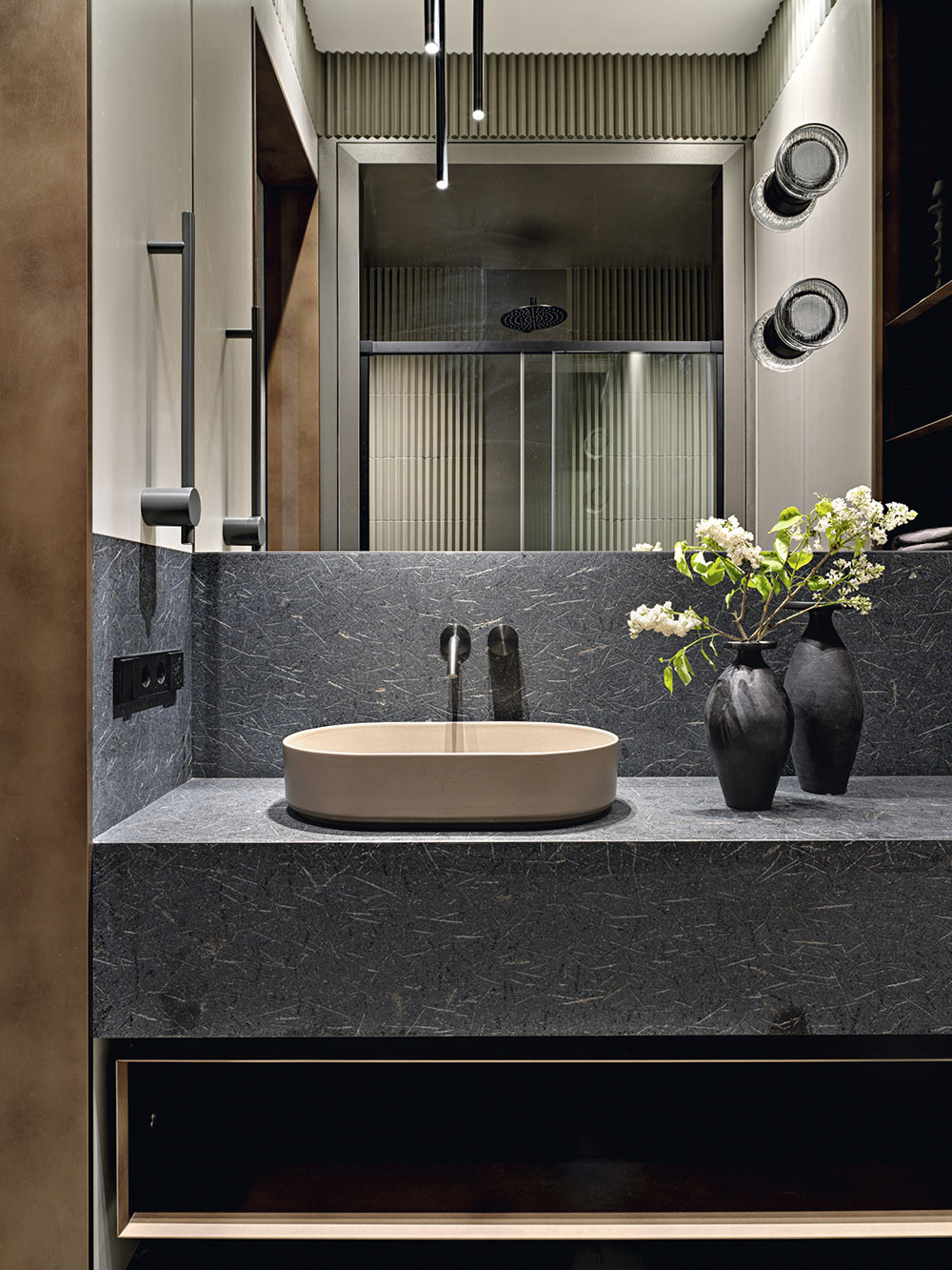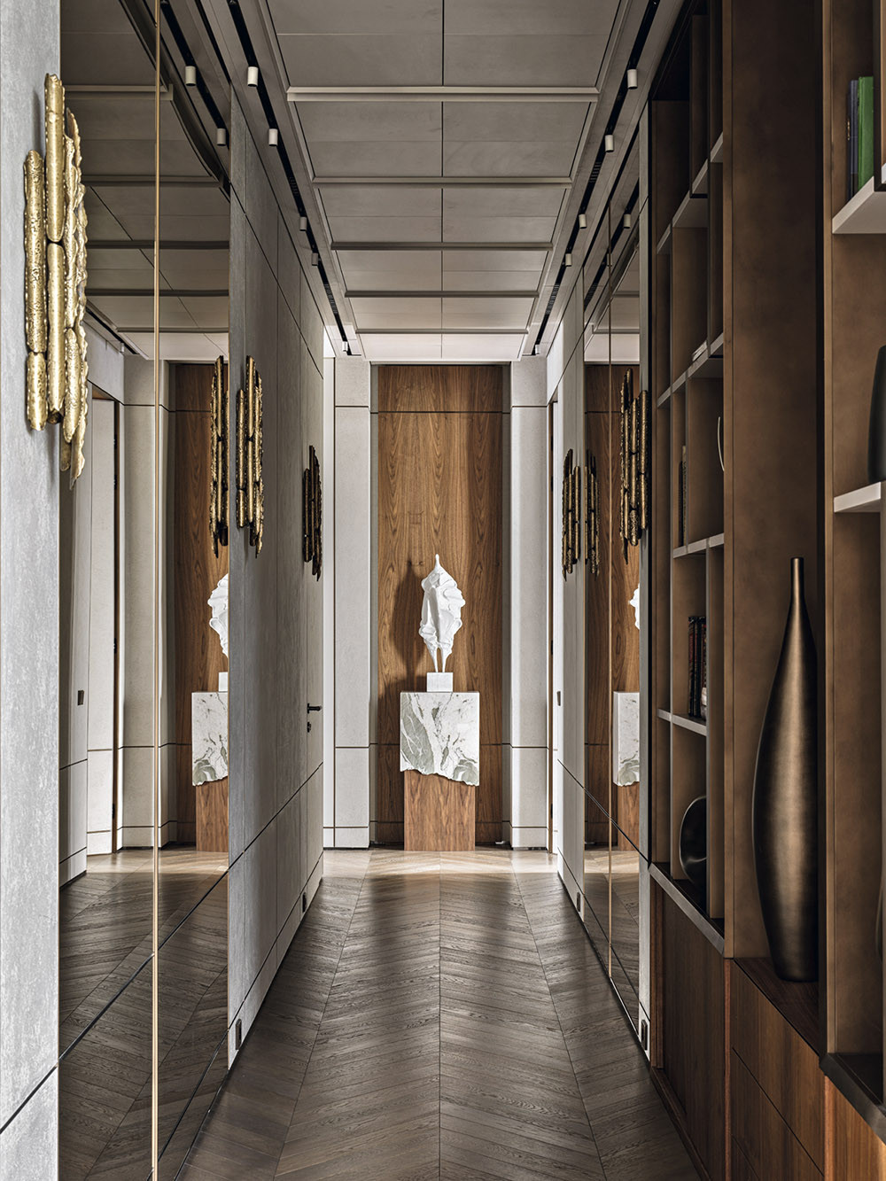 Многие решения продиктованы планировкой. В результате объединения квартир появился очень длинный холл, который соединил гостевую и приватную зоны. Нино Зварковская решила сделать этот недостаток «изюминкой» интерьера: здесь асимметрично разместили зеркала, а чтобы впустить в коридор естественный свет, его отделили от гостиной стеклянной перегородкой Rimadesio. Заключительным штрихом служит скульптура на пьедестале в холле, которая силуэтом просматривается из гостиной. Тот же прием применили в прихожей. Квартира имеет панорамное остекление, и автору проекта хотелось, чтобы солнце проникало и сюда. Одна из стен частично превратилась в нишу — только шкаф из рифленого стекла отделяет прихожую от гостиной. Непредсказуемая игра света каждый раз вдыхает новую жизнь в изначально монотонное пространство. Заказчик очень любит натуральные материалы и текстуры, и по его запросу в гостиной появился выразительный мрамор Cipollino с узором, напоминающим слои луковицы. Облицованный им камин стал отправной точкой для всего интерьера комнаты. Кварцит Patagonia объединяет прихожую с пространством гостевого санузла. Остров в кухне-столовой выполнен из другого вида кварцита — Moon Ray: его зеленоватый узор, похожий на крупные листья, отсылает к «природной» теме и перекликается с серо-зеленой мебелью.