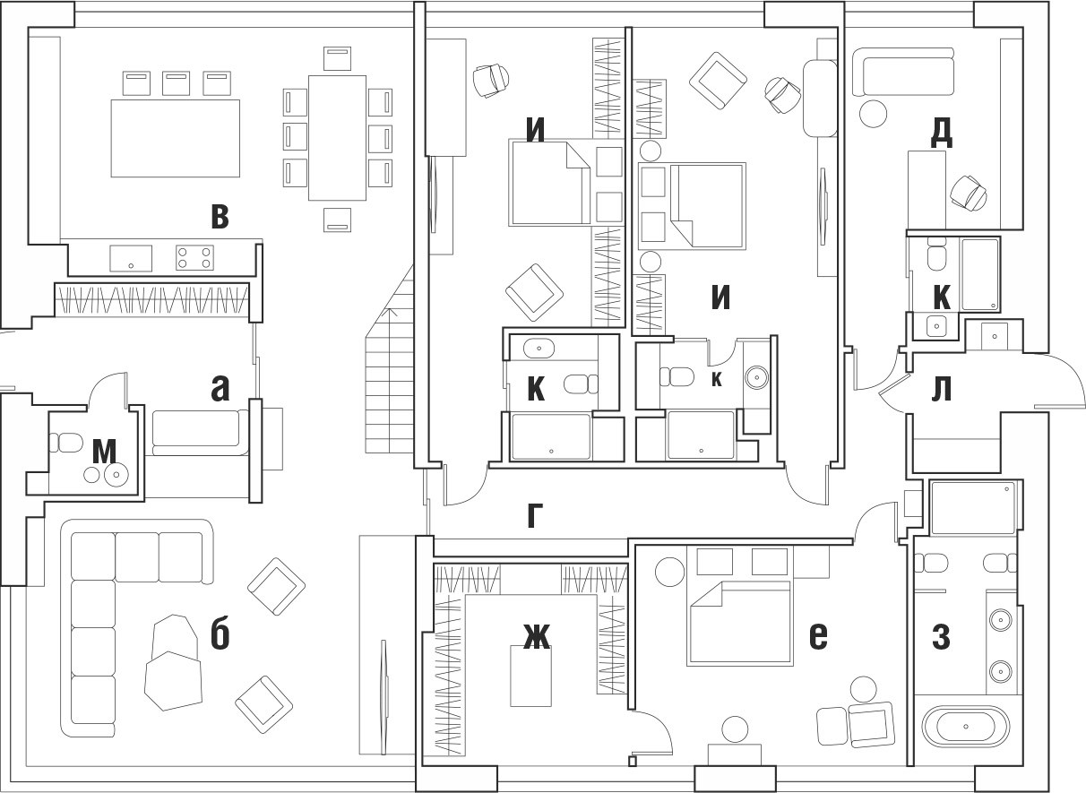 а) прихожая б) гостиная в) кухня-столовая г) холл д) кабинет е) спальня хозяев ж) гардеробная з) ванная комната и) детские комнаты к) санузлы л) постирочная м) гостевой санузел