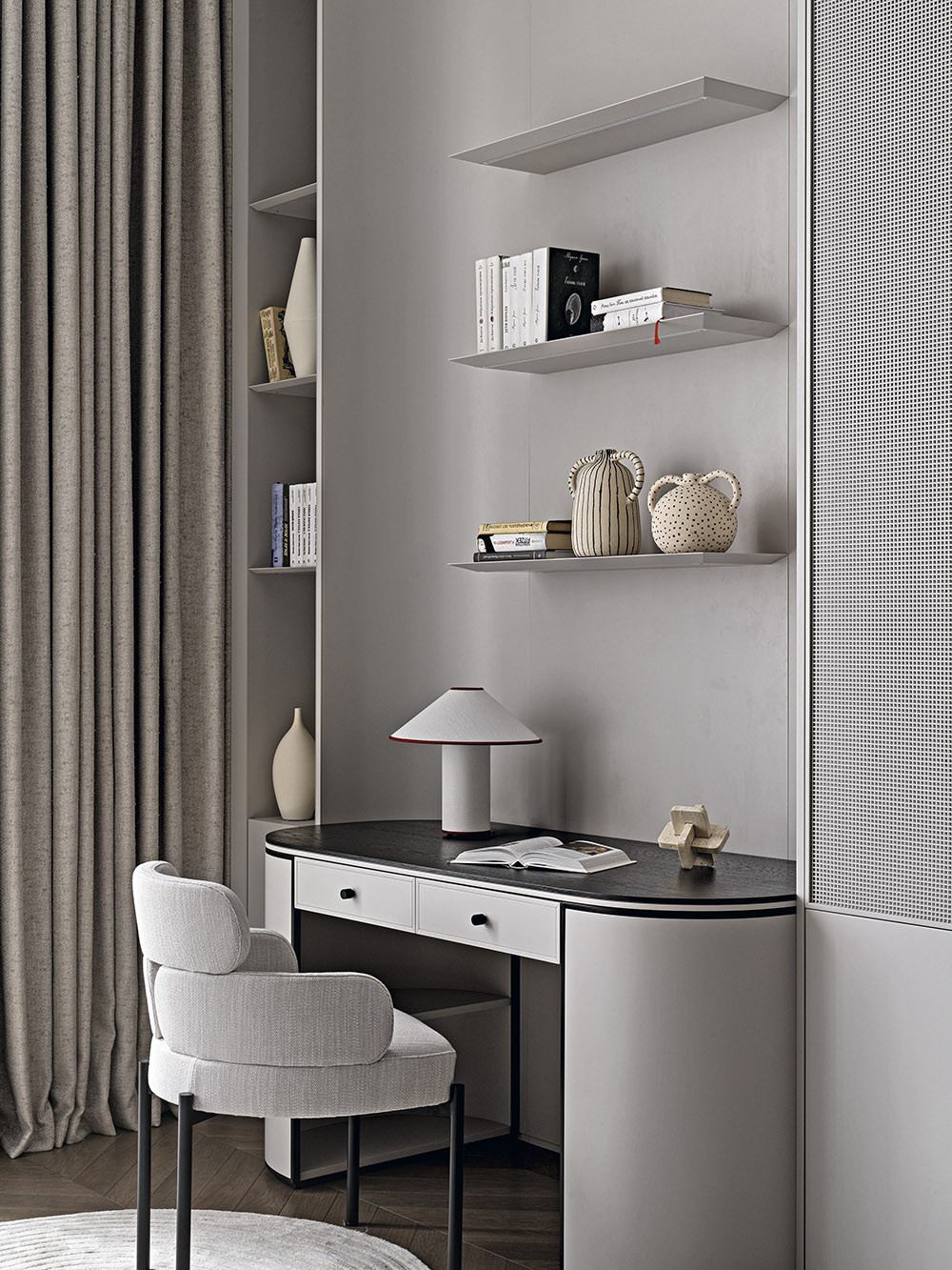 Комната девочки — настоящий оазис покоя и света, где напряженность сведена к минимуму благодаря тактильности и нейтральным оттенкам. Классическую геометрию сглаживают плавные линии мебели и декора. Слева и справа от кровати — симметричные шкафы с округлыми арочными молдингами. «Если вам нужно добиться легкости — смягчайте углы. Этот прием работает как в жизни, так и в дизайне», — дает совет Нино Зварковская.