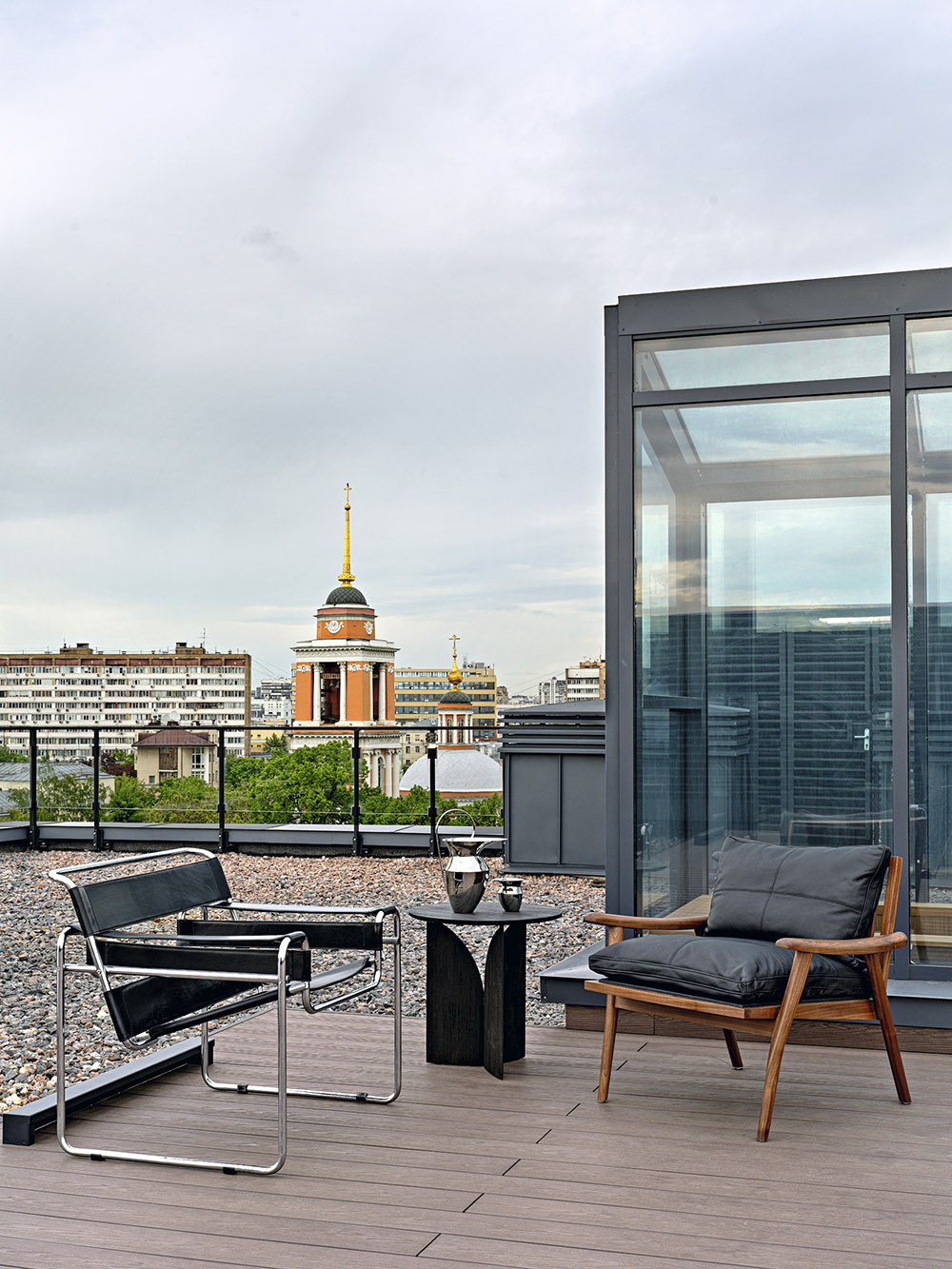 Квартира площадью 250 кв. м находится на Ордынке, среди тихих переулков и старинных особняков. Современный камерный ЖК с внутренним садом гармонично вписался в историческую застройку Замоскворечья. Парадоксальным образом локация сочетает в себе расположение в самом центре мегаполиса с атмосферой размеренности и уединения. Неоспоримое преимущество квартиры — терраса на крыше, с которой открывается невероятно красивый вид на старую Москву и церковь начала XIX века. Заказчики — современная молодая семья с двумя детьми — купили две квартиры в разных подъездах и хотели соединить их, сохранив отдельные входы с разных сторон пентхауса. С Нино Зварковской и ее архитектурным бюро владельцы познакомились по воле случая. «Лифт отключили именно в тот день, когда заказчик приезжал в свою квартиру. Спускаясь по лестнице, он заметил открытую дверь в квартире двумя этажами ниже — наша команда как раз заканчивала там ремонт и принимала мебель. Естественно, любопытство взяло верх, и он не смог не заглянуть в открытую дверь соседей. С этого момента мы начали писать наш новый «роман», — рассказывает архитектор.