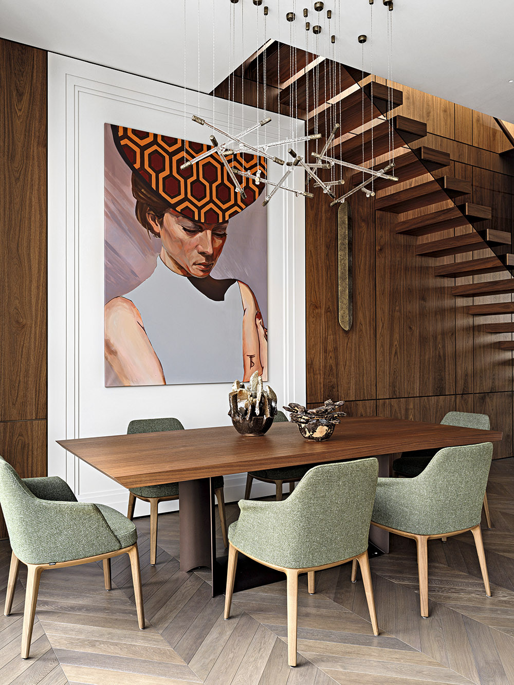 Обеденный стол расположен на одной оси с островом, а завершает интерьер столовой солидных размеров картина от Тома Барнаби. Микс ярких, контрастных видов камня оказался непростой задачей для архитектора, но итоговое сочетание выглядит безупречным.