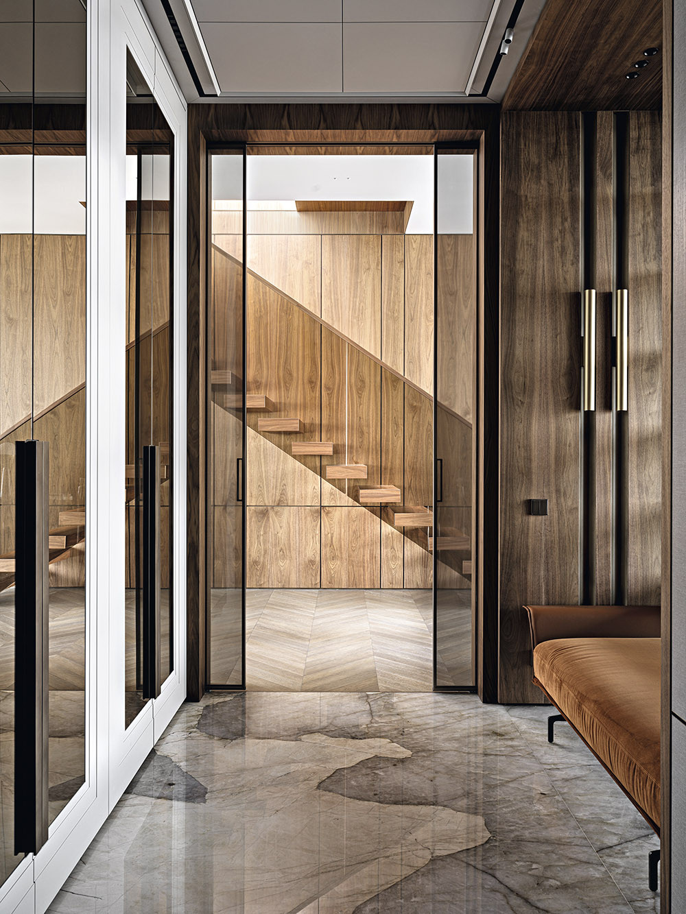 Из гостевой зоны на террасу взлетает лестница из дерева и стекла с парящими консольными ступенями. Это конечная точка маршрута и смысловой центр композиции, видный сразу от входа. «Над этой легкостью мы долго трудились. Нам нравится использовать игру света и тени, и на стадии проектирования мы всегда пытаемся предугадать, каким будет этот эффект в реальности», — комментирует замысел автор проекта.