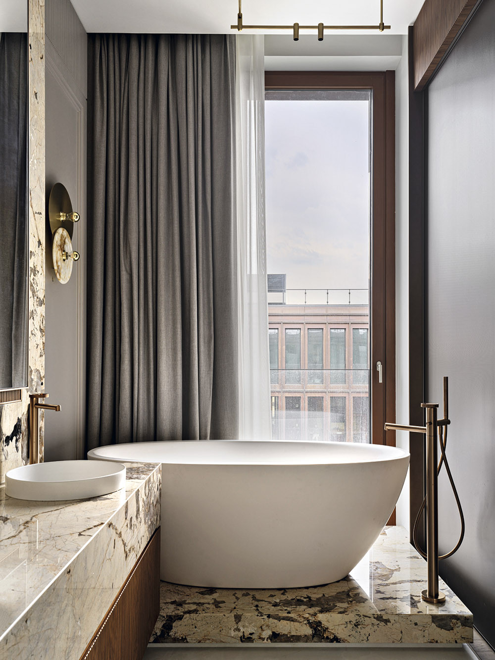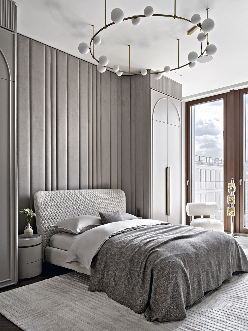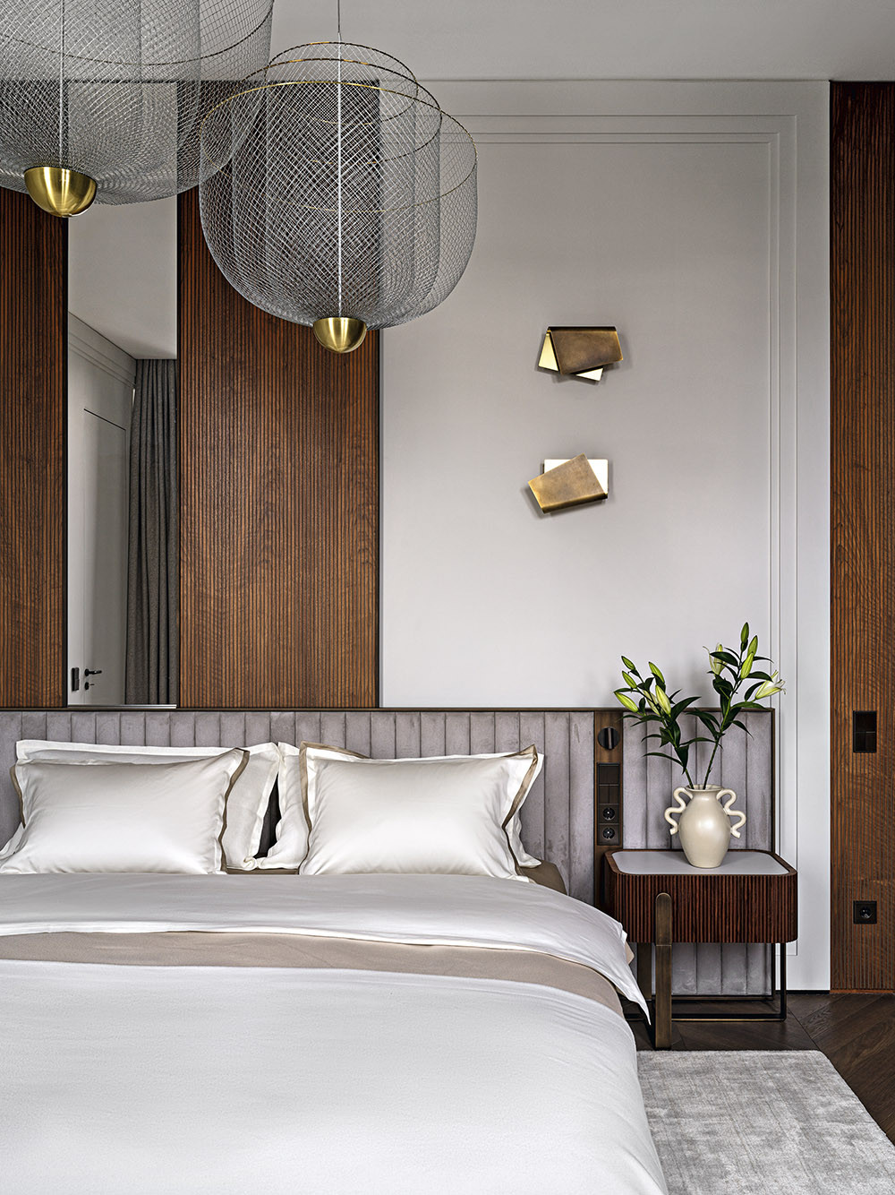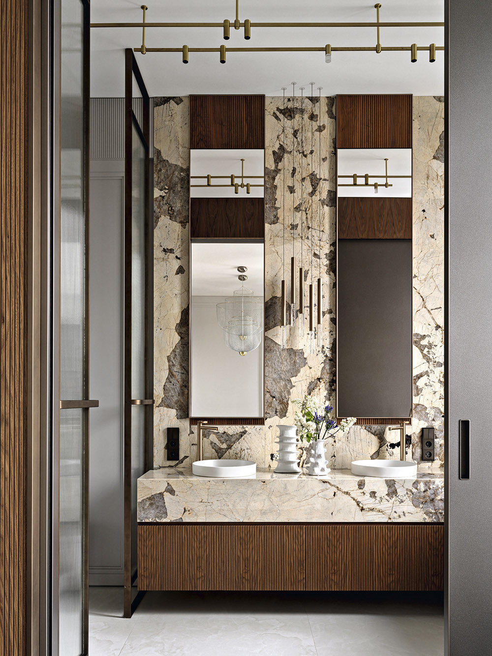 Уютная приватная зона включает в себя хозяйский блок, детские и кабинет. В спальне хозяев расположилась внушительная кровать: из-за нестандартных размеров ее сделали на заказ по индивидуальному проекту. Респектабельное пространство оживляют бронзовые настенные светильники и люстра из проволочной сетки от голландского бренда Moooi Meshmatics. К главной спальне примыкают просторная гардеробная и санузел (и то и другое — с окнами). Ванная комната находится за гигантскими раздвижными перегородками. Архитектор постаралась сделать вид из спальни максимально эстетичным — красивые зеркала в обрамлении кварцита создают здесь особую атмосферу роскоши.