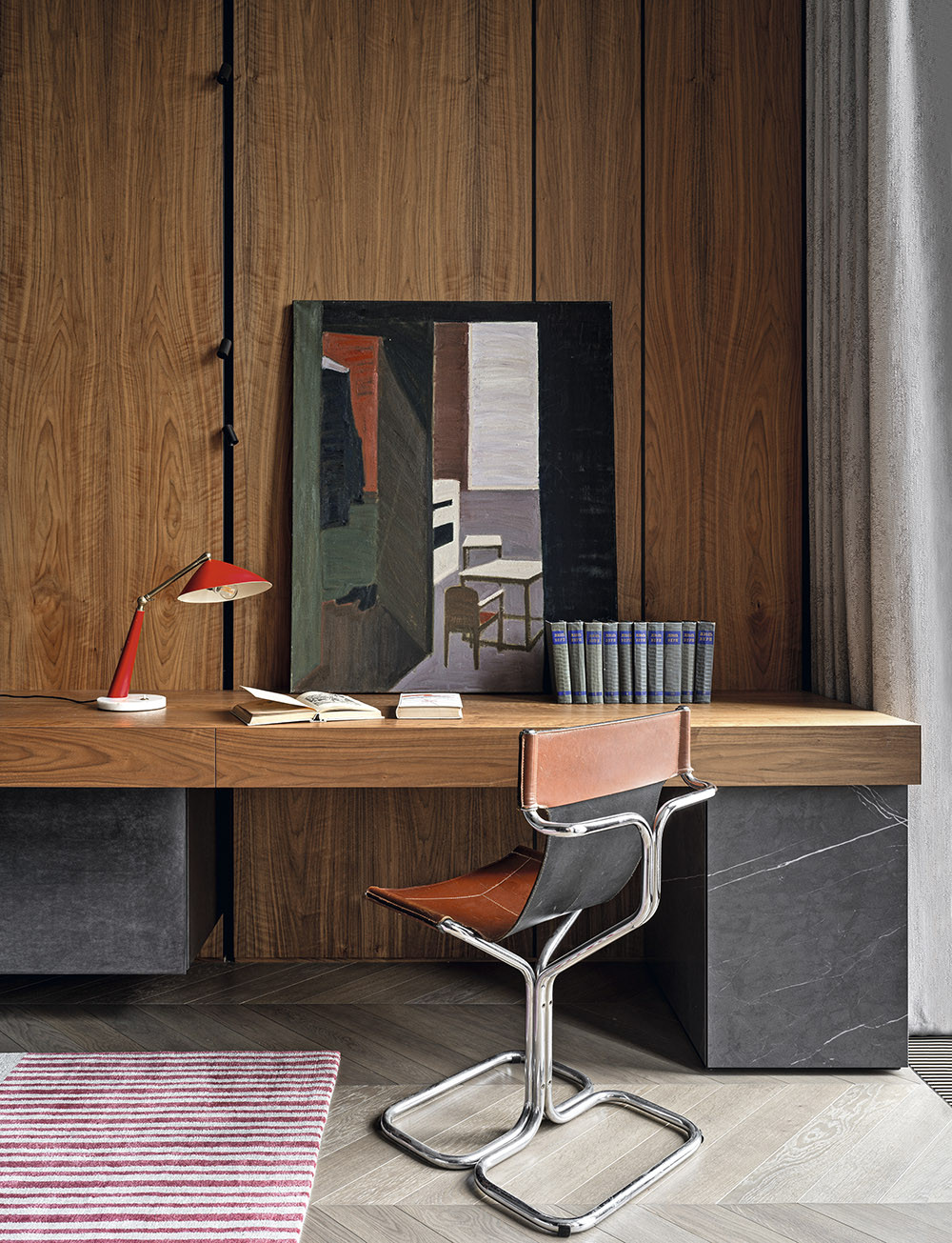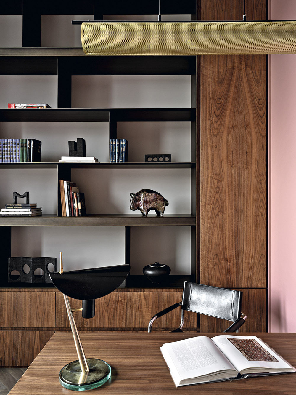 Гостиная может быть и воздушной благодаря обилию света, и уютной в непогоду из-за теплых оттенков дерева и притягивающего взгляды камина. Диван, Giulio Marelli. Кресла и подушки, Poliform. Журнальный стол изготовлен на заказ. Ковер из шерсти и арт-шелка, KULTURAKOVROV. Торшер Gubi, L’Appartement. На стеллаже — вазы Modenature