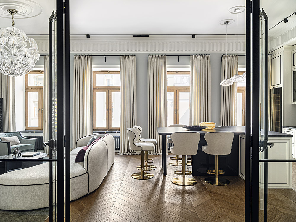 Четырехэтажный доходный дом с фасадами в стиле поздний модерн возвели в 1908 году по проекту архитектора В. И. Мясникова, он был тогда частью городской усадьбы Соколовых-Сибиряковых. Здание не реконструировали и не ремонтировали более ста лет, но в 2015-м в доме произошел пожар — понадобилась масштабная реставрация. Теперь дому возвращен исторический облик. На главном фасаде выделяются два выступающих ризалита с парадными лестницами и входами, которые делят его на три части; карниз над третьим этажом украшает широкий лепной фриз в стиле неоклассицизм — с крылатыми грифонами и пальметтами. На лестничных клетках завершена реставрация метлахской плитки, ступеней из доломита, металлических ограждений, деревянных поручней и карнизов. «В доме расположено всего десять квартир, — рассказывает автор проекта, — и в одной из них мне посчастливилось создавать интерьер для семьи из четырех человек, для супругов и их двух дочерей. Заказчики очень гордятся исторической значимостью своего дома и просили максимально подчеркнуть это в интерьере». Елена Сваринь создала изящный респектабельный интерьер в духе современной классики. Здесь нет флешбэков стиля модерн — характерных изгибающихся линий, при этом созданы определенные параллели с архитектурой дома и неоклассицистским декором фасада: это широкие строгие карнизы, членение стен молдингами, масштаб и ритм окон. «Так как дом является памятником архитектуры, замена окон оказалась невозможной, — рассказывает Елена, — поэтому нам пришлось мириться с небольшими оконными проемами и классической раскладкой остекления. Чтобы квартира казалась светлой, воздушной, мы приняли решение оформить интерьер в светлых тонах; а кроме того, в стилистику привнесли элементы стиля современной французской квартиры — это добавило пространству легкости, элегантности, парижского шика». Так, перегородка из стекла и металла на входе в гостиную создана