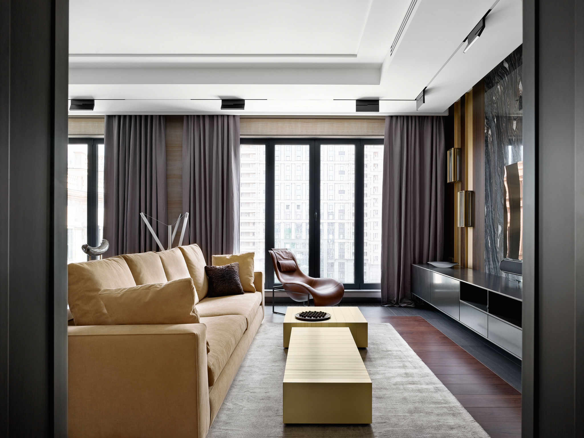 Квартира расположена в клубном особняке рядом с Тверской. Авторская архитектура здания с элементами ар–деко, дорогой отделкой фасадов и солидным лобби создала спокойную атмосферу статусного закрытого клуба. Она и была взята за отправную точку при проектировании интерьера для семейной пары с ребёнком. «В базовой планировке мы столкнулись с тем, что в квартире была маленькая спальня и большой балкон. Поэтому было принято решение их объединить,—комментирует руководитель проекта Игорь Ситкилов.—В целом приватный блок хозяев занимает почти половину всей площади и включает в себя спальню, гардеробную и большую ванную комнату. Также перепланировка коснулась и основного пространства—мы разместили кухню, столовую и гостиную в одном помещении». Заказчики не планировали жить в этой квартире постоянно, они хотели иметь собственную альтернативу отельному номеру, чтобы останавливаться во время частых приездов в Москву. Этим отчасти и объясняется такая расстановка приоритетов в планировке и выдержанный стиль без ярких акцентов. Но, к слову, жизнь здесь оказалась настолько комфортной, что семья рассматривает для себя варианты переезда в Москву. «Самой сильной стороной этого проекта стало абсолютное доверие со стороны заказчиков,—вспоминает ведущий дизайнер Александр Козырев.— Единственным их пожеланием был выбор современной стилистики, которой мы и придерживались. Остальное—на наше усмотрение. Можно сказать, что этот интерьер мы проектировали на свой вкус, выбирая исключительно натуральные материалы—мрамор, оникс, ценные породы дерева, 100 % шёлк, каракуль, карбон, а также мебель итальянских фабрик, декор и текстиль Armani / Casa. Они лучше всего соответствовали статусу дома и стилистике интерьера». Интерьер действительно производит цельное сбалансированное