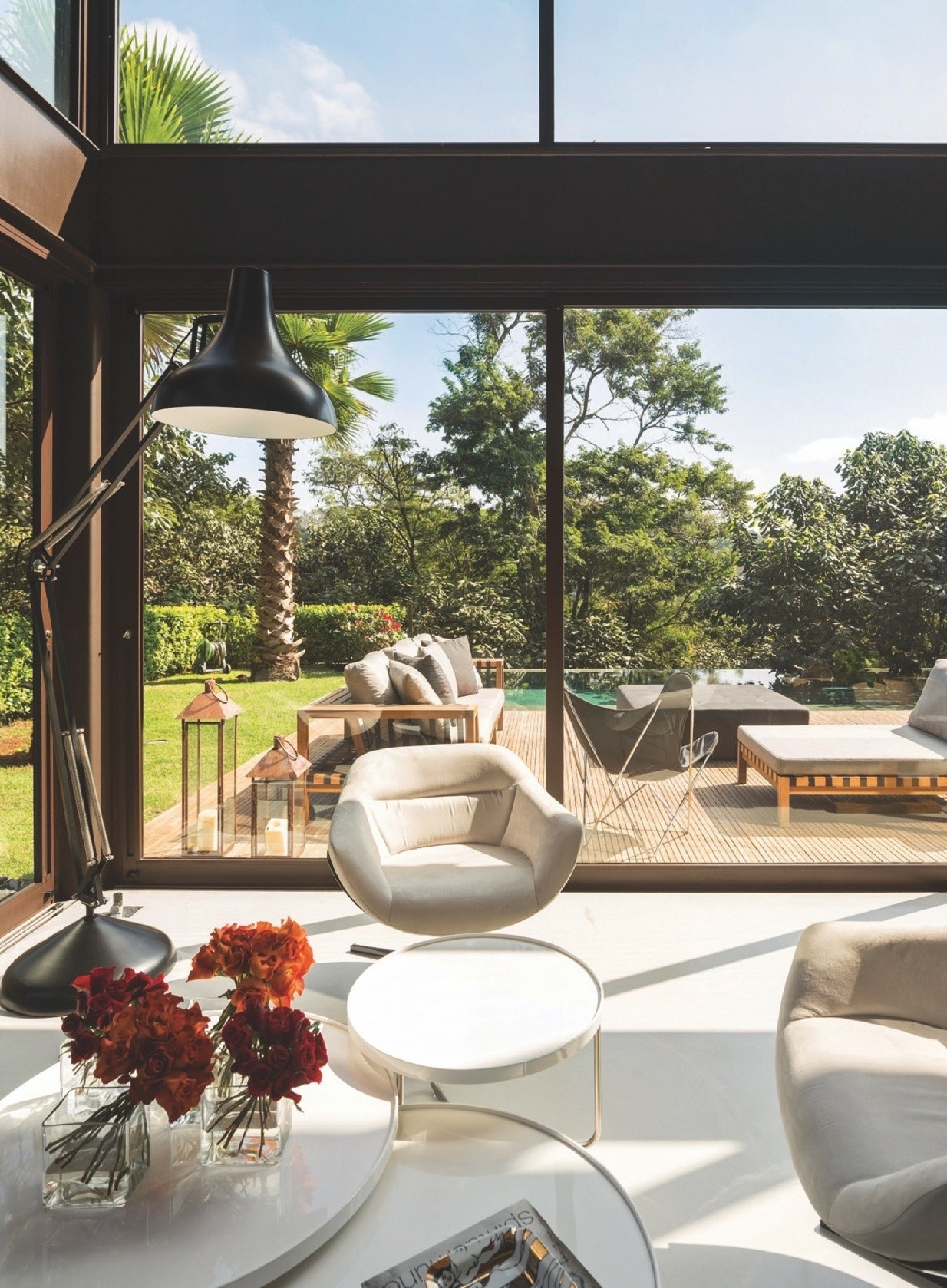 «Меня завораживает его умение минимумом средств выразить главное в архитектуре — объём и пропорции», — говорит она. Дом в Сан–Паулу стоит на крутом склоне холма, что потребовало от архитектора виртуозной планировки. Она вписала постройку в участок, постаравшись максимально сохранить деревья, которыми усажен склон,