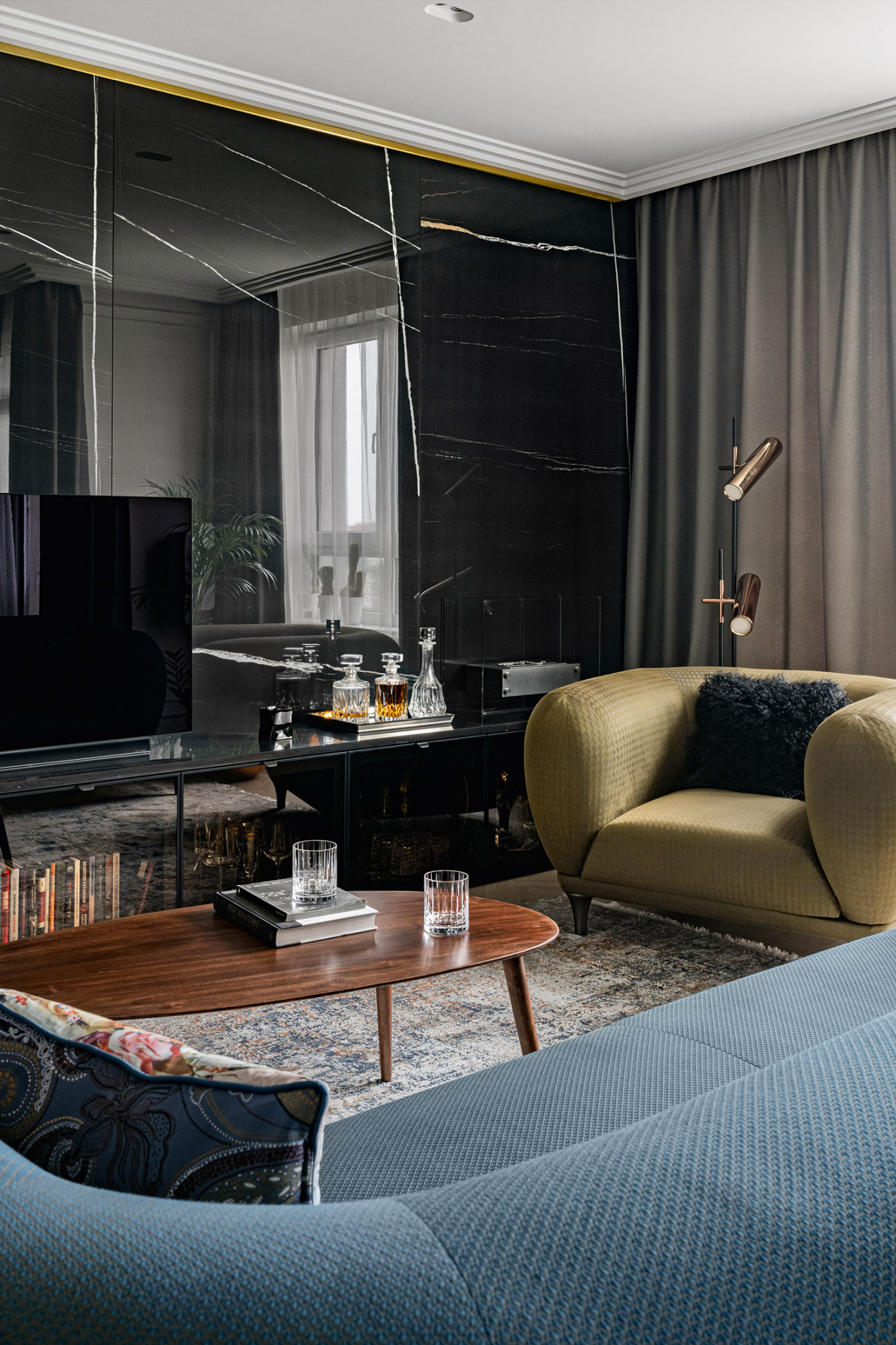 Гостиная — элегантное пространство с акцентной стеной из чёрного керамогранита. Диван, кресло, дизйнер Марсель Вандерс, Roche Bobois