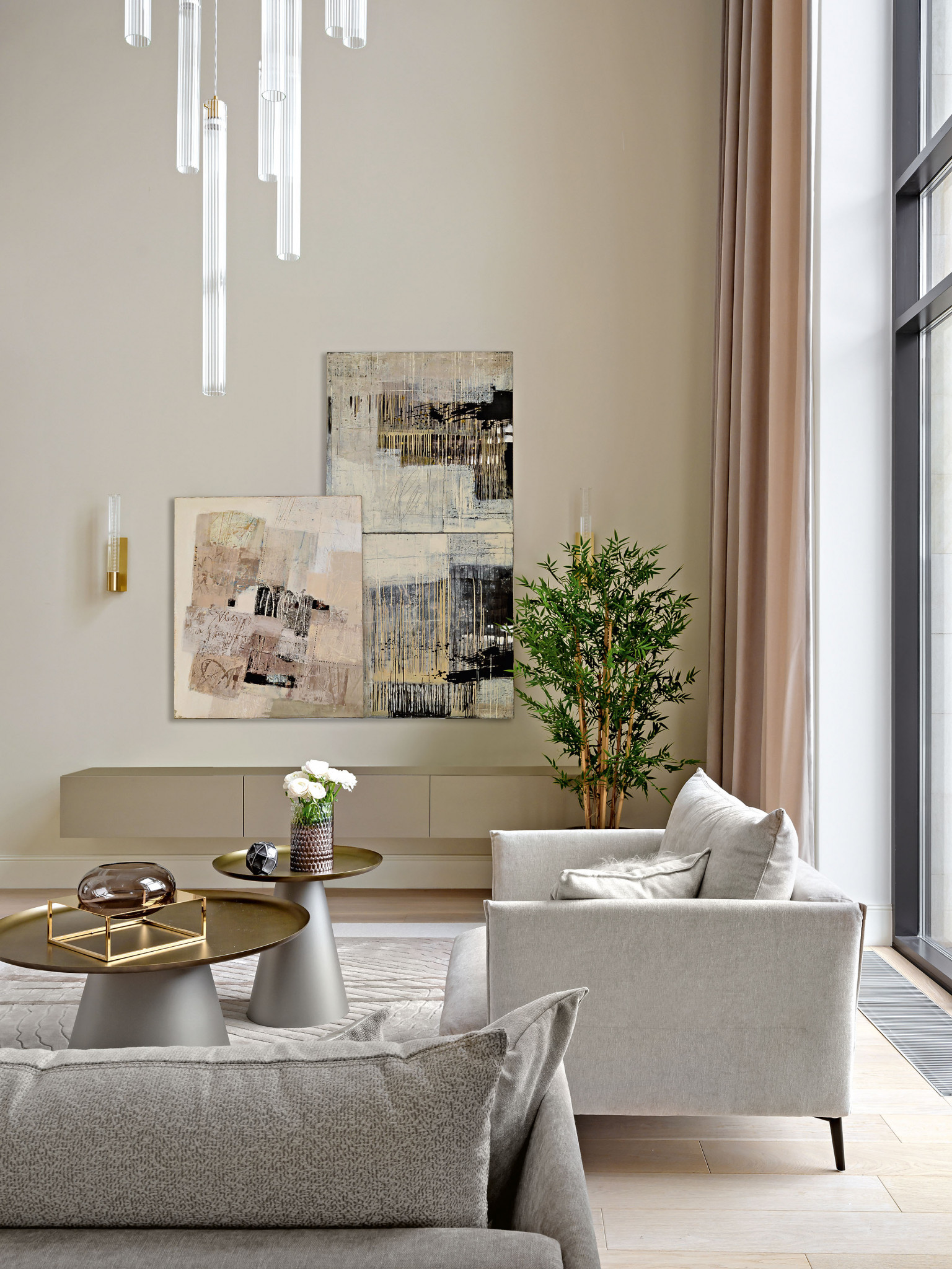 Наталья практикует комплексный подход к работе над проектом и учитывает важную связь интерьера с экстерьером, поэтому параллельно со строительством особняка продумала и ландшафтный дизайн, и подбор растений, и декоративную подсветку. «Мне было важно, какие виды будут открываться из окон, хотелось, чтобы природа вошла в дом», — говорит она. Что касается цветовой гаммы, хозяева предпочли монохромный и очень спокойный интерьер в бежево–серых оттенках (песка и тумана!). За стилистическую константу был взят ар–деко — парадный, но не вычурный. В отделке фасада использованы песчаник и гранит, террасы выложены немецкой клинкерной плиткой. Светло–песчаный и молочный оттенки фасада плавно перетекают в интерьер. Небольшие тональные контрасты зрительно увеличивают объём и создают отличный фон для предметов искусства, декора и мебели от итальянских, испанских и немецких фабрик. Планировка поделена на несколько зон: на первом этаже расположены гостевые и хозяйственные,