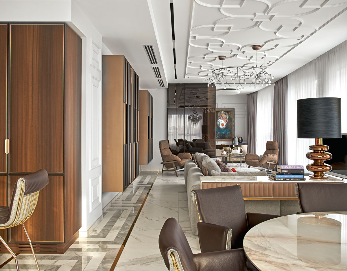 Квартира находится в Екатеринбурге, в жилом комплексе Forum City, спроектированном голландским архитектурным бюро LEVS. Изначально это были две квартиры, которые объединили в одну, в результате чего появилось большое пространство общей площадью более двухсот квадратных метров. Округлые очертания фасада с большими окнами давали чудесную инсоляцию, но создавали определённые трудности из‑за небольшого расстояния от входа и несущих колонн, которые в свою очередь сокращали возможность манёвра для организации объёма. «Следуя пожеланиям владельцев, пространство мы разделили на две зоны: общественную и приватную, — рассказывает автор проекта. — Немаловажным условием было размещение трёх санузлов и хозяйственной комнаты со стирально–сушильными автоматами (в семье уже подрастает малыш, и в планах увеличение семьи, поэтому необходимость частых стирок была очевидна на самом раннем этапе). В приватном блоке оборудовали спальню с гардеробной и ванной комнатами и две детские, одна из которых запланирована на будущее».