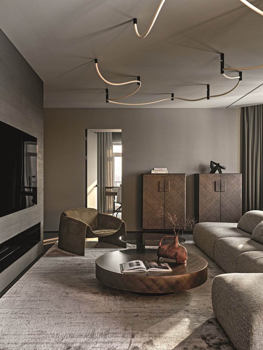В самом сердце Липецка для молодой семьи была создана «квартира-настроение». Главным пожеланием заказчиков стала атмосфера расслабленного домашнего вечера за просмотром фильмов и настольными играми с друзьями. Команде REFRESH architecture&design во главе с основателем и ведущим дизайнером Аленой Абрамовой предстояло воплотить этот образ в современном минималистичном пространстве, наполнить его текстурой и глубиной. «После первой встречи с заказчиками рождается главный образ — атмосфера, в которой я могу их представить, — говорит Алена. — В данном случае ключевой стала их просьба: гостиная в темных тонах и настроение пятничного вечера. Так появилась цветофактурная палитра: брашированная бронза, черный сланец, тонированное стекло, жженое дерево, замша и яркий керамогранит. Получился стильный, брутальный интерьер, с немного драматичной атмосферой».