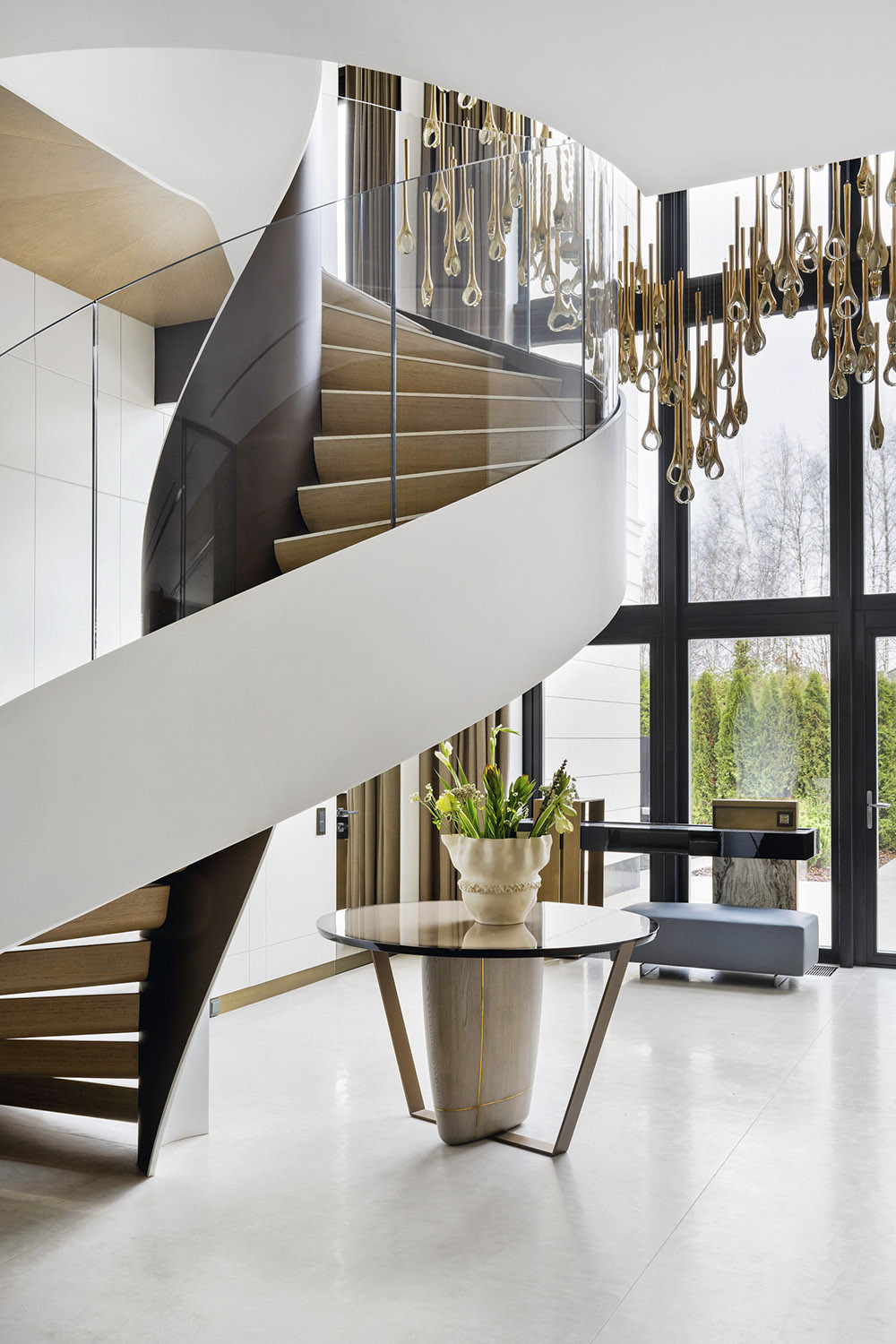 Обсуждая с дизайнером будущий стиль дома, хозяева сказали, что им импонирует минимализм, но, как выяснилось, они имели в виду более теплый по ощущению интерьер. Неперегруженный, с чистыми линиями, с общностью решений во всех помещениях — скорее, в стиле софт-минимализм. Минимализм в чистом виде казался им излишне холодным и жестким. Кроме того, они были не готовы жертвовать комфортом в пользу концептуальных решений в духе аскетизма. Таким образом родилась идея единого по стилю лаконичного пространства со стеновыми панелями из шпона дерева и с высокими дверями. А создать свое, особое настроение в каждой отдельной комнате помогли индивидуальные детали интерьера — предметы мебели, освещение, текстиль, ковры. «Работа над проектом шла в тесном сотрудничестве с хозяйкой, — отмечает дизайнер. — Она трепетно заботилась об удобстве каждого члена семьи». В итоге все получилось так, как было задумано, — статусное, респектабельное современное пространство с атмосферой гармонии, тишины и покоя. Первый этаж дома и холл второго света открывается взору прямо от входа. Все помещения перетекают одно в другое: холл — в зону кухни, гостиной и столовой, которые, в свою очередь, решены как единая зона. Из холла открывается вид и на зону бассейна (когда открыта дверь, разделяющая эти части пространства). На втором этаже расположены приватные помещения, причем для каждого члена семьи создана своя зона. Здесь находятся апартаменты дочери с ванной комнатой и гардеробной, жилое пространство сына с отдельными своими ванной комнатой и гардеробной, а также блок родителей — спальня, гардеробная, ванная комната и тренажерный зал. Есть также гостевая спальня с ванной комнатой. «Было важно, сохраняя целостность образа и заботясь об уместности каждой детали, отработать в каждой из зон свой сложный и разнообразный функционал», — объясняет Екатерина Кузнецова.