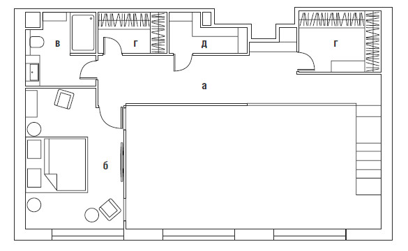 II этаж: а) антресоль–библиотека; б) спальня; в) ванная комната; г) гардеробные комнаты; д) комната для хранения обуви.