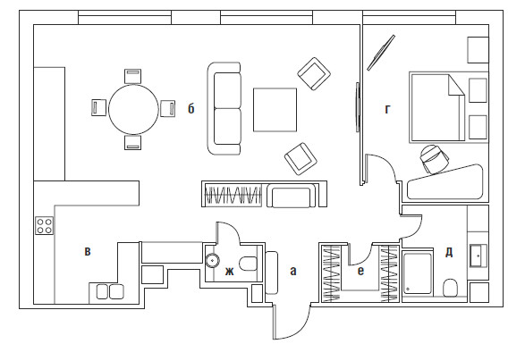 I этаж: а) прихожая; б) гостиная–столовая; в) кухня; г) спальня; д) ванная комната; е) гардеробная; ж) гостевой санузел.