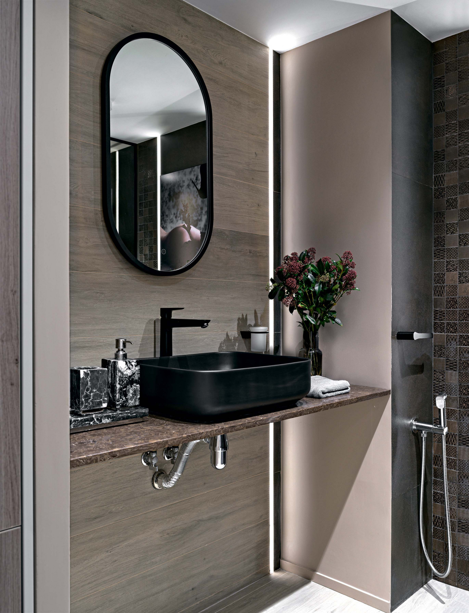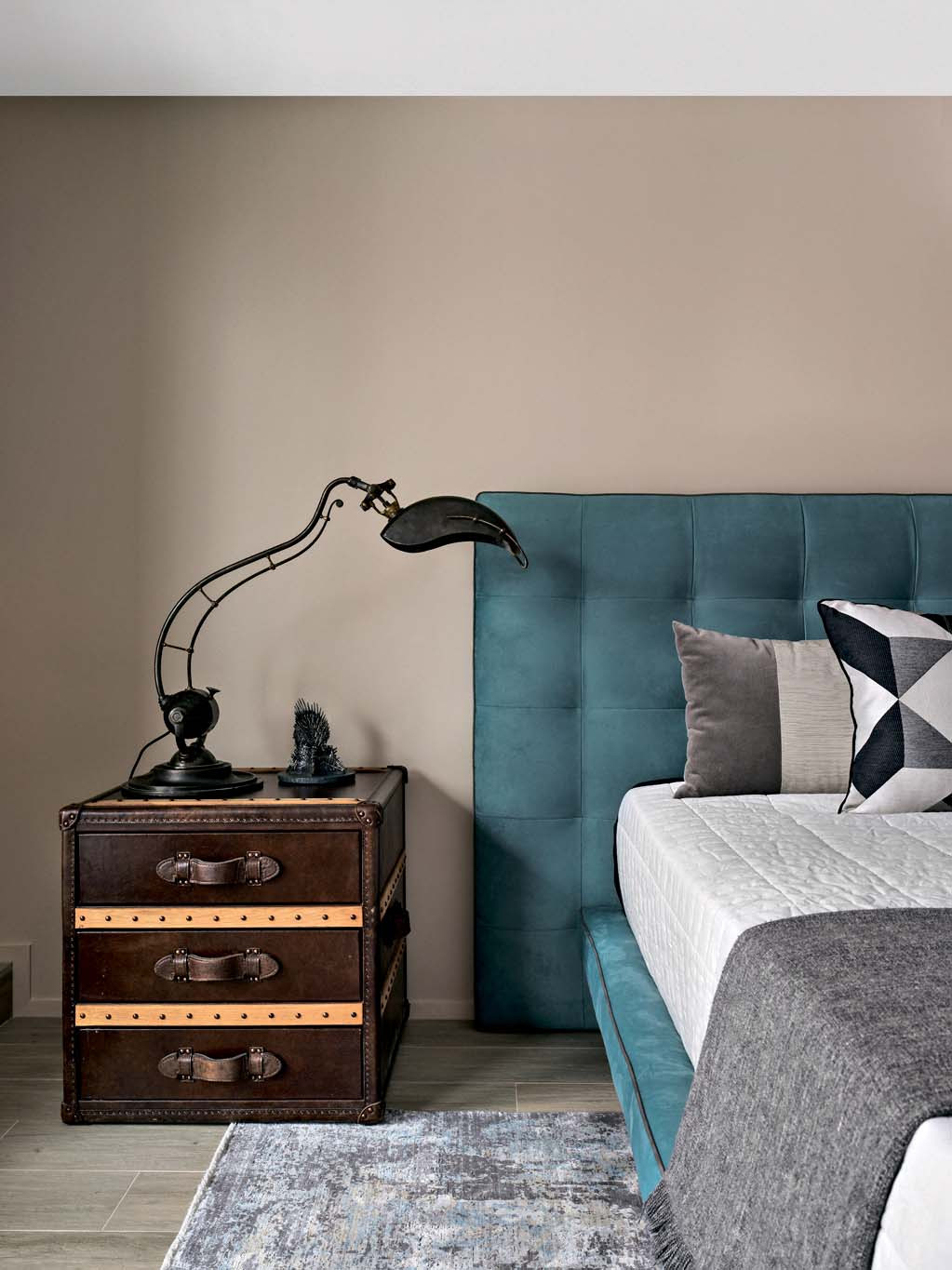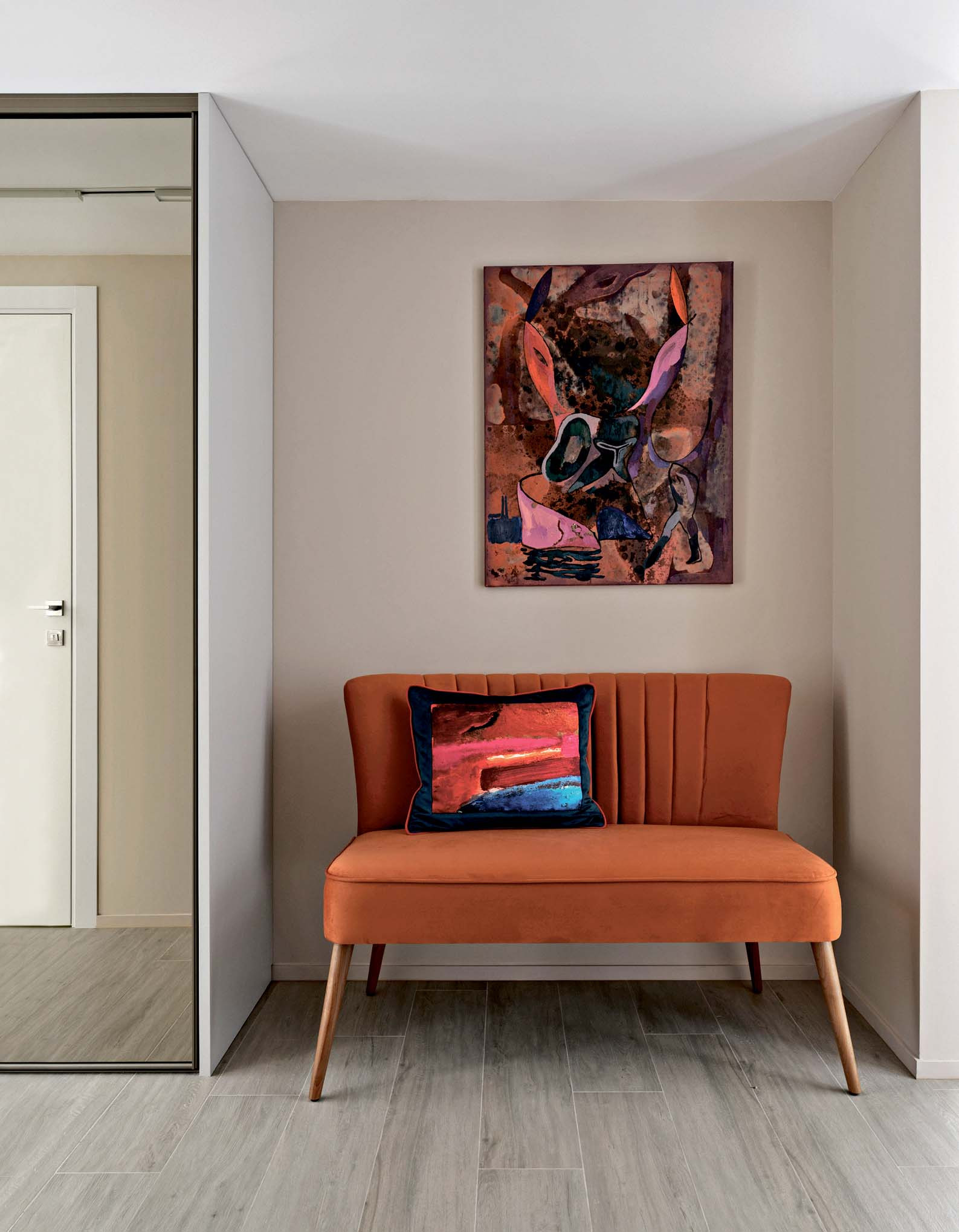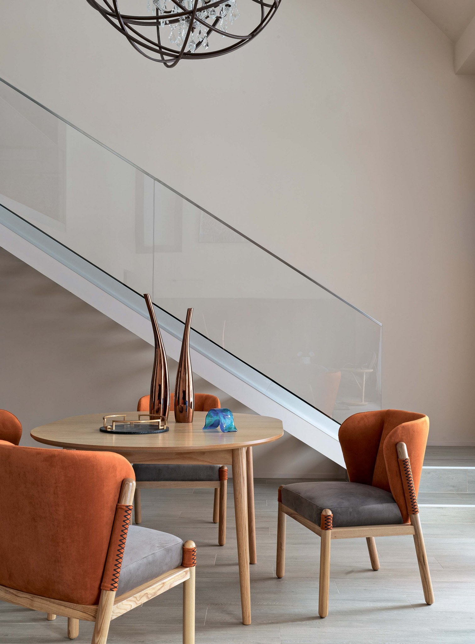 Пески Марокко в оранжево-терракотовых деталях и васильковое небо в обивке мебели соединяются на фоне мягкого песчано– бежевого фона», — рассказывает Александр. В отделке он также обращается к натуральным материалам, таким как дерево, камень, лён. Немаловажную роль в проекте играет освещение. Это встраиваемые трекерные системы, различные диодные подсветки и главный акцент второго света — люстра–шар над столовой зоной. Лаконичные бра в вечернее время настраивают на покой и тишину. Несмотря на современность интерьера, от системы «умный дом» заказчик отказался, оставив лишь системы управления текстилем на окнах и электрическими рулонными шторами.