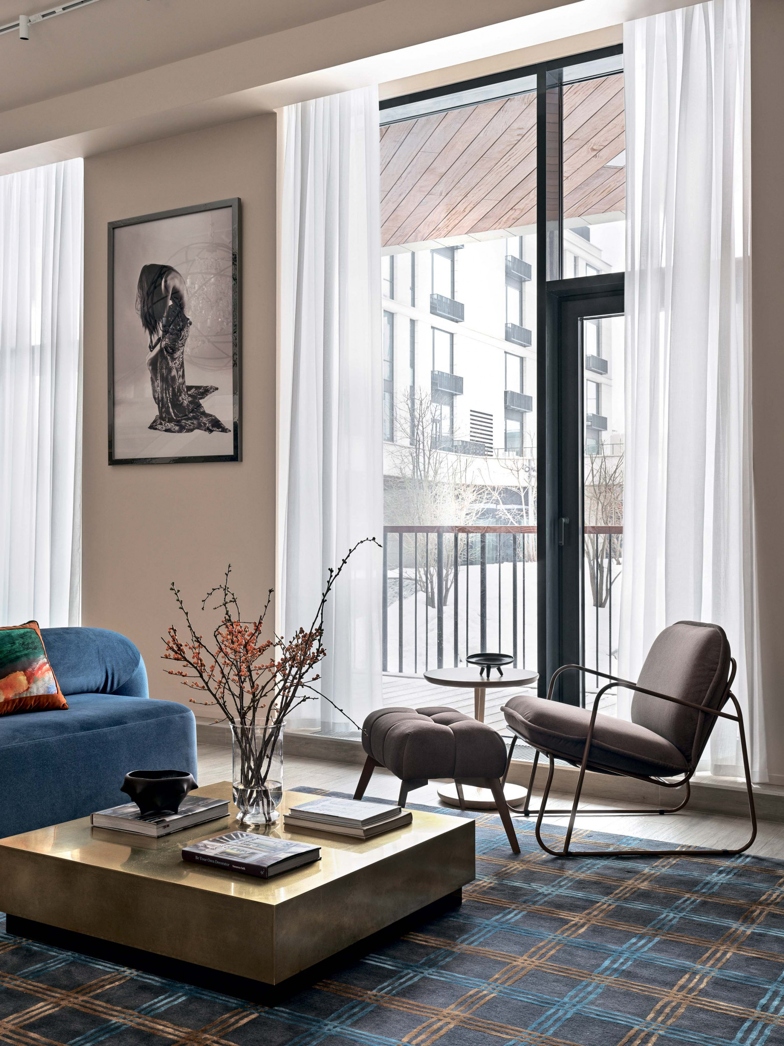 Из гостиной можно выйти на собственную террасу площадью 17 кв. м. Пару кресел Tuttu Monteor от Levantin Design в кофейном цвете дополняют приставные банкетки Anni House. В простенке между окнами висит монохромная картина от самой молодой художницы Испании — Кристины Отеро