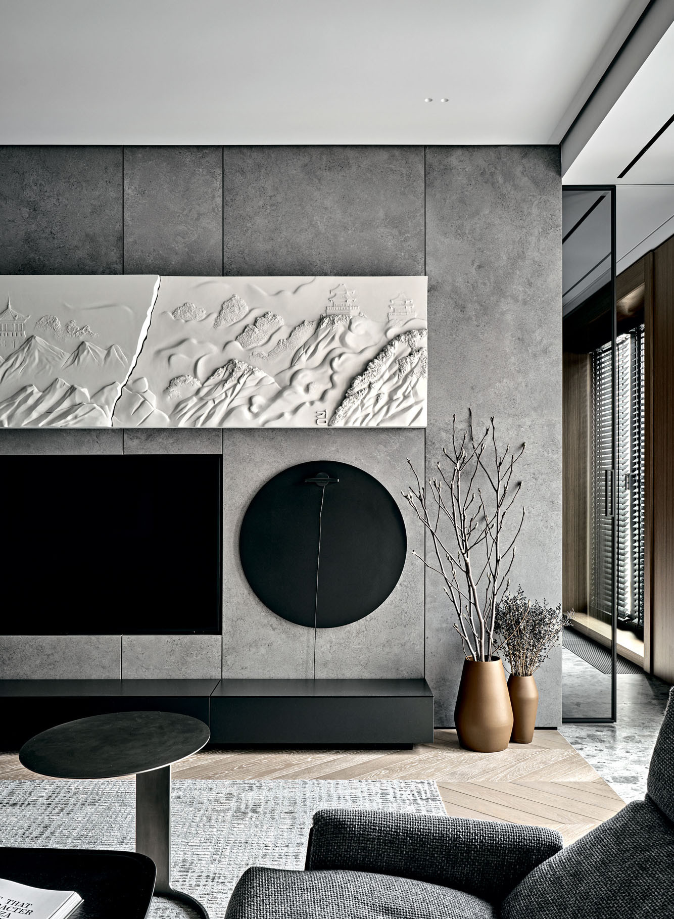 Фрагмент гостиной. Темное пятно утопленного в нишу ТВ дополняет черный металлический диск со светильником на магните от From Lighting и напольный подиум с хранением. Кресло и столик — Henge. Непальский ковер с шелком, Jerome Botanic. Гипсовый барельеф изготовлен на заказ компанией KIMART. Вентиляционные решетки, Invisiline