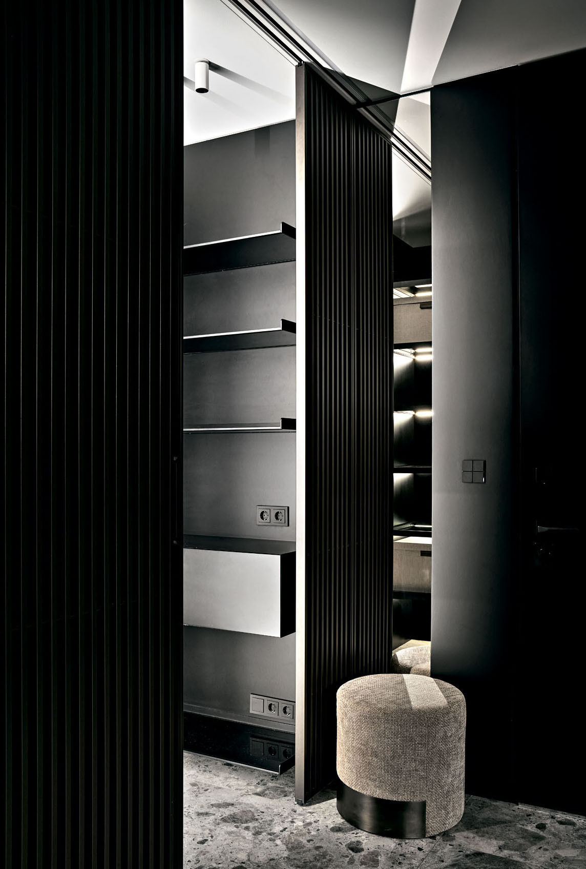 Гардероб для верхней одежды создан по авторским чертежам и расположен справа от входа за реечной перегородкой со стеклом от Rimadesio. В отделке преобладают темное дерево, черный металл и тонированное стекло. Строгость композиции смягчают паркет в виде французской елочки и теплая подсветка полок