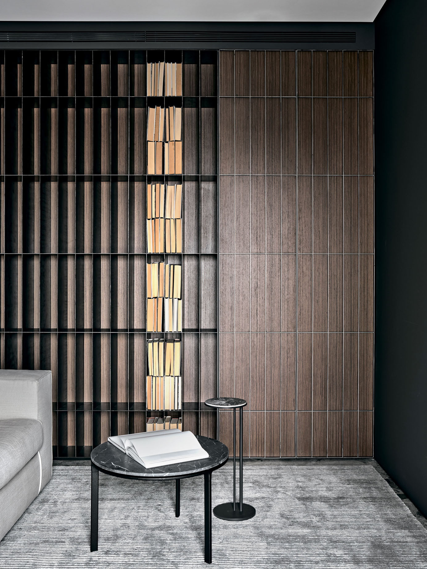 Фрагмент кабинета. Вороненый стеллаж был разработан по авторским чертежам дизайнеров ARTIMITRO и занимает всю стену напротив окна. Стеллаж включает закрытую деревянную секцию, но его основной объем сконструирован из стали. Вес стеллажа — около 800кг. Как вспоминают авторы проекта, подъем объекта в апартаменты и его монтаж были непростыми. Диван, Living Divani. Столик, Cattelan Italia. Торшер, Luceplan. Ковер, Jerome Botanic