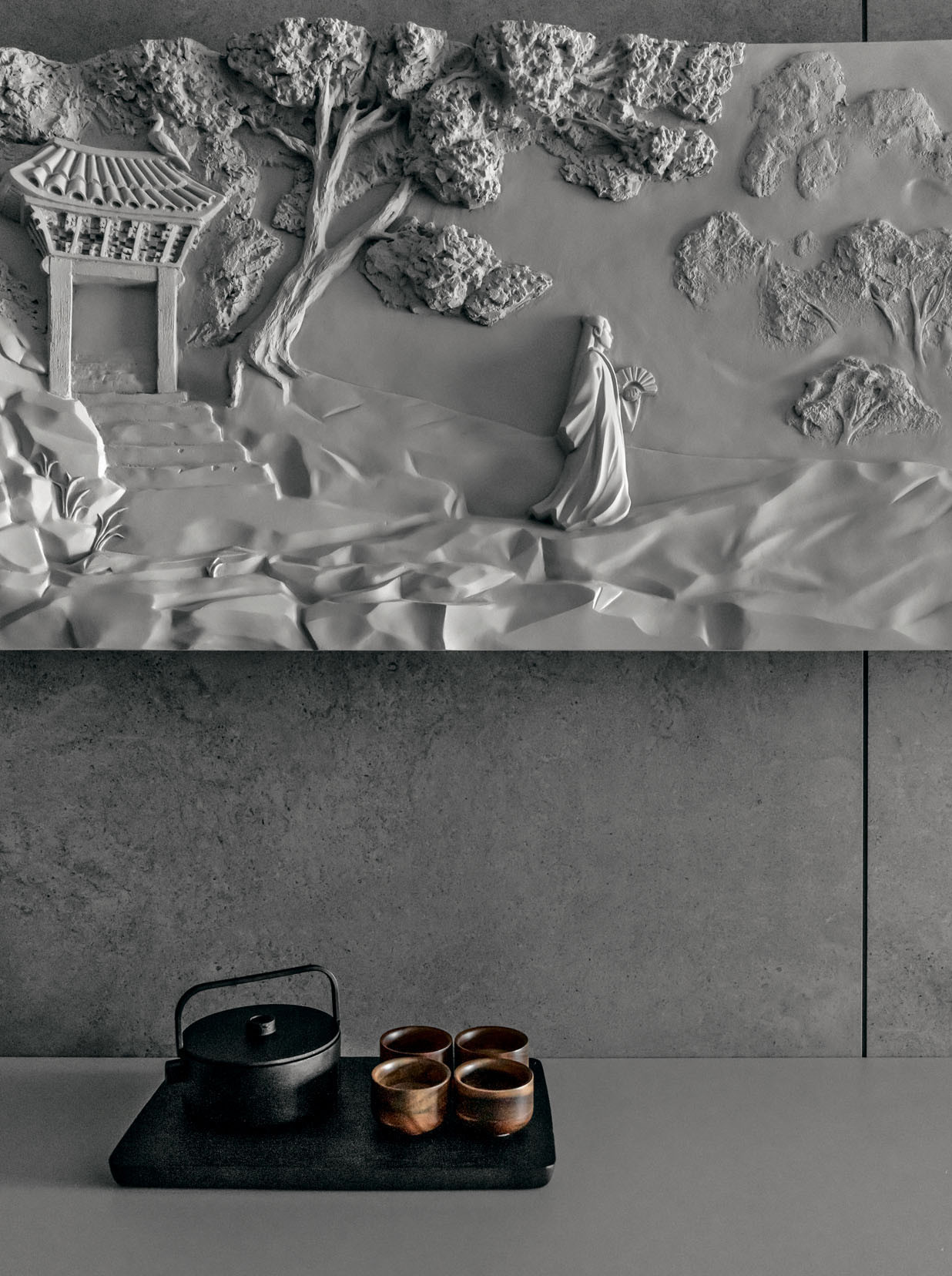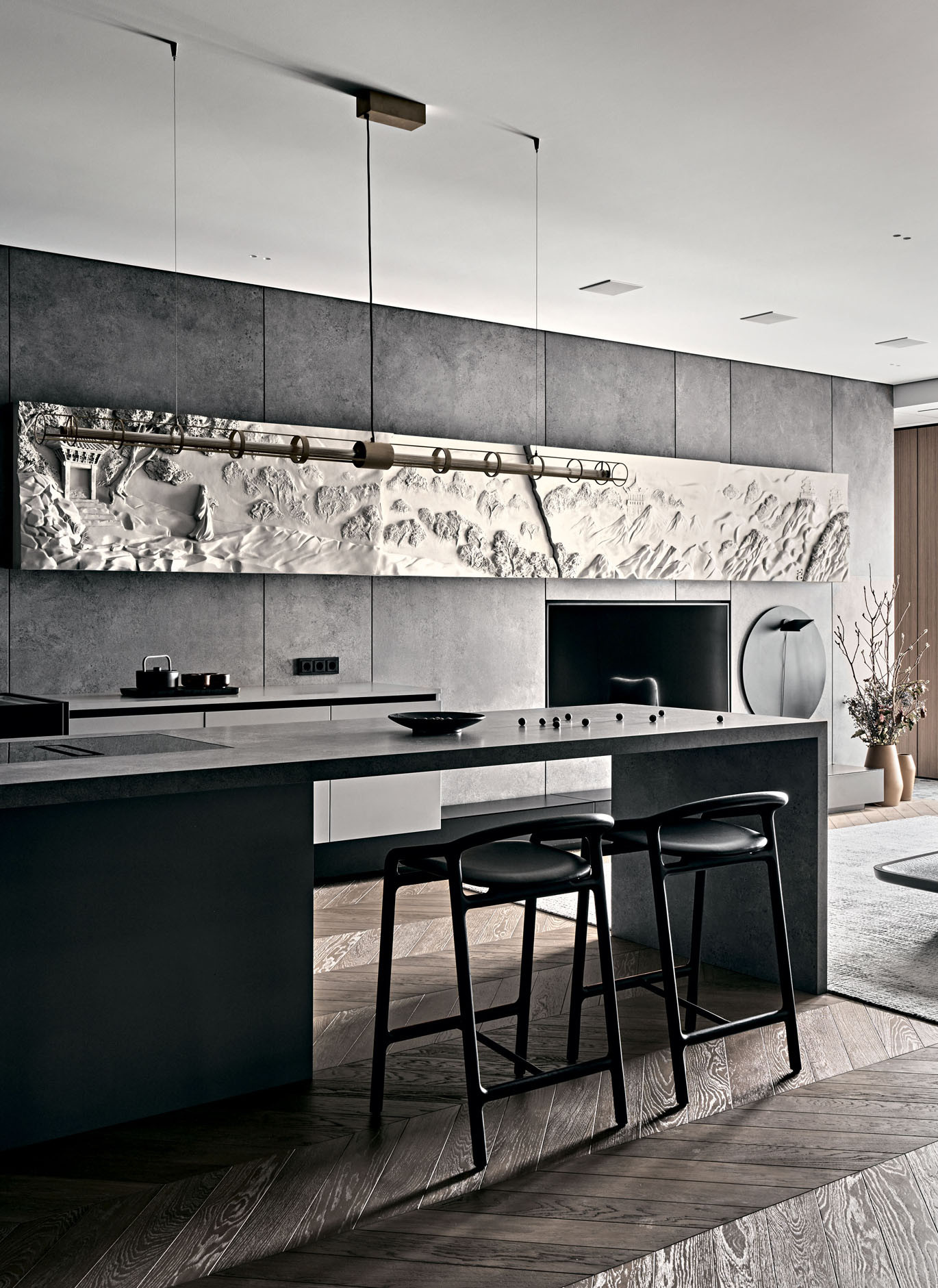 Фрагмент кухни-гостиной. На каменной стене над подвесной тумбой с раковиной дизайнеры установили гипсовый барельеф длиной 5,5 метра, вручную выполненный специалистами студии Леонида Кима. Панно идеально вписалось в концепцию интерьера, ведь его сюжет вдохновлен китайскими гравюрами