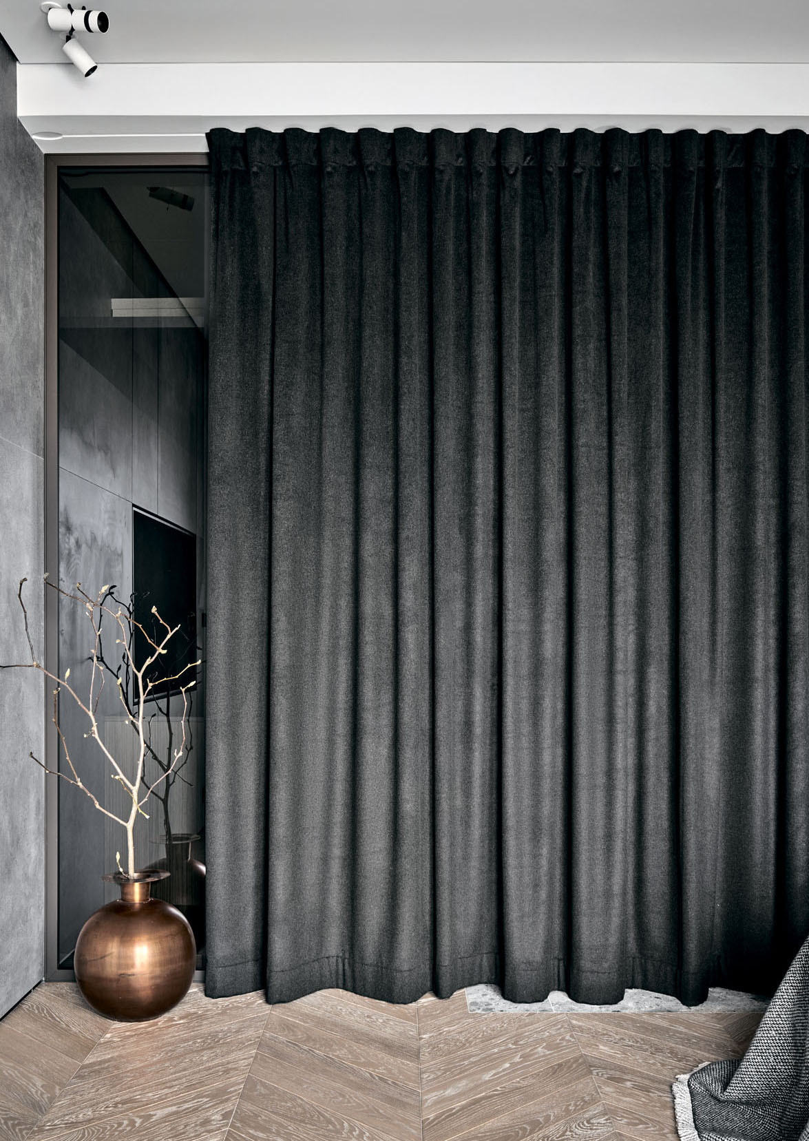 Зона санузла и гардероба отделена от зоны отдыха перегородкой из тонированного стекла, которую при необходимости можно закрыть. «Мы долго согласовывали текстиль, — вспоминают авторы. — В итоге мы установили портьеры из темной пальтовой шерсти, фактура которой напоминает шинель»