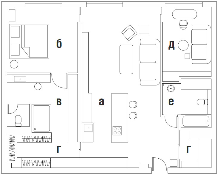 Фрагмент гостиной. Чтобы достичь максимальной воздушности, авторы не стали привязывать новые стены к несущим бетонным колоннам: одну из них обнажили полностью возле дивана. Еще две колонны выходят из стен возле входной двери и в спальне