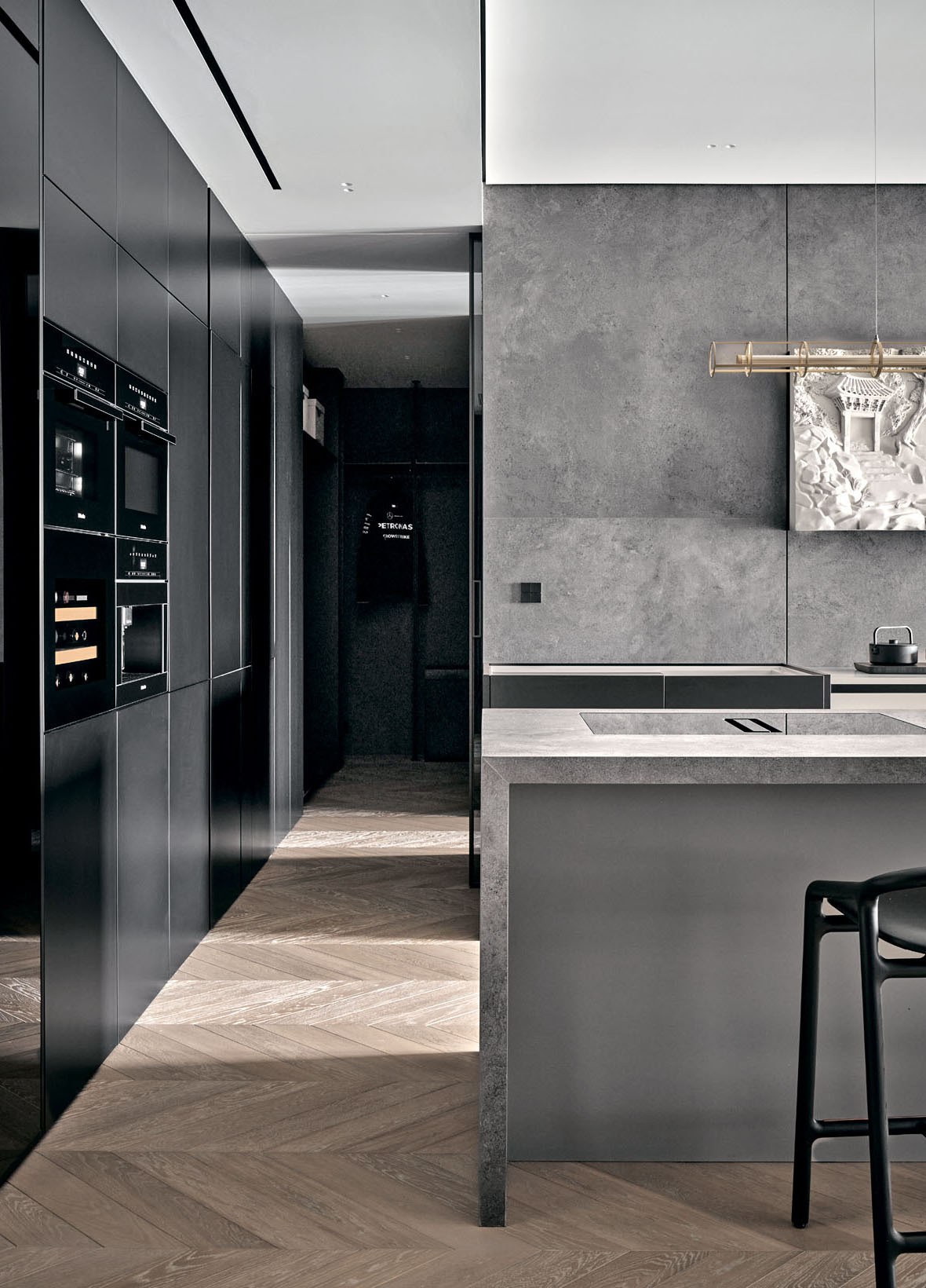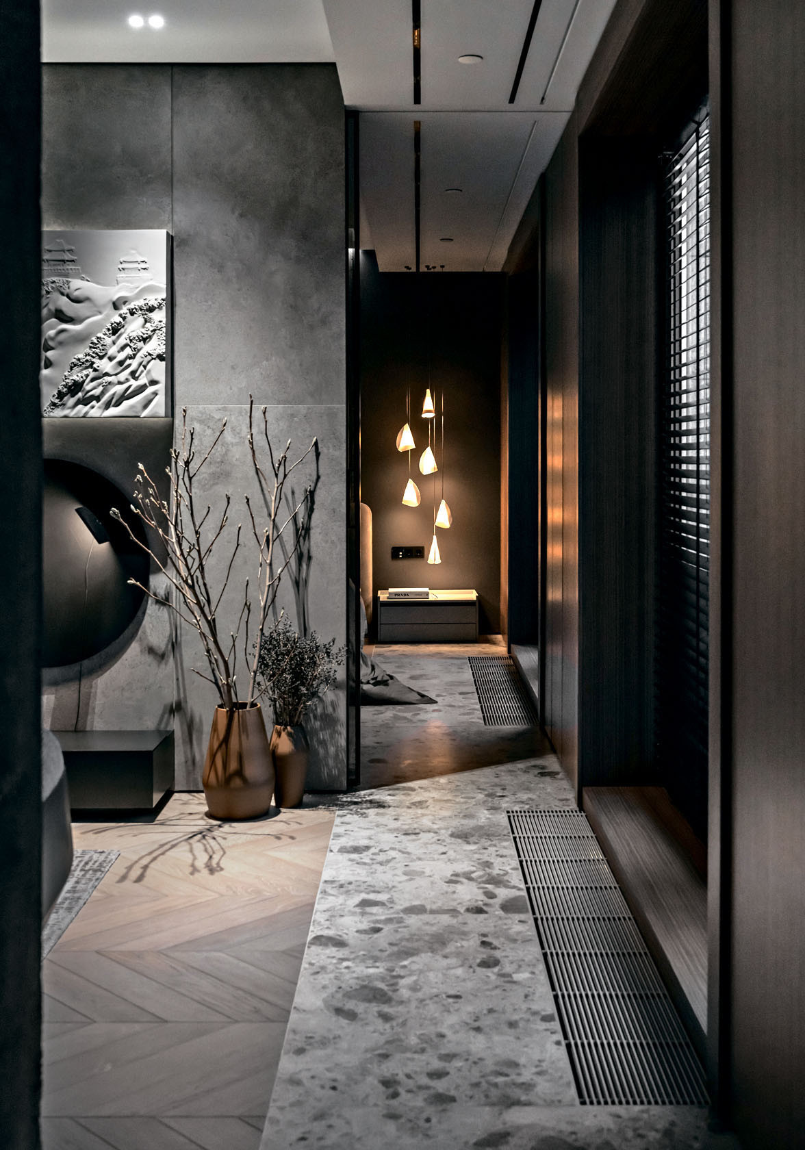 Стилистически интерьер вдохновлен монументальностью сталинской архитектуры и азиатскими мотивами, которые отражены в названии жилого комплекса и отвечают эстетическим предпочтениям владелицы. В материалах и геометрии пространства прослеживаются аскетизм, натуральность и медитативность, вызывающие ассоциации с садом камней — это пространство действительно создано для того, чтобы замедлиться и обрести равновесие. «Вы даже не представляете, насколько среда влияет на наш образ мыслей, какой мощный это инструмент, как важно окружать себя правильными предметами, находиться в правильных пропорциях», — отмечает Артур Митрошкин.