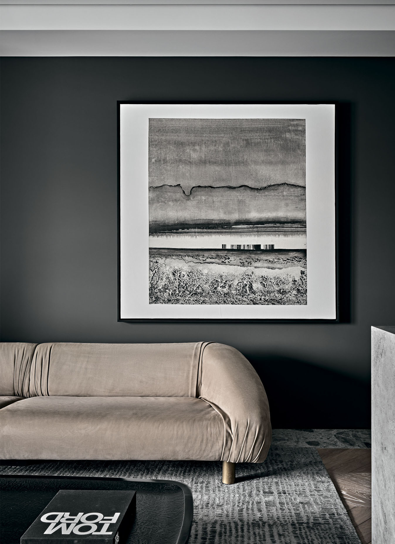 Мягкая зона в гостиной организована диваном и столиком от Baxter. За такую форму дивана дизайнерам пришлось побороться: эта модель редко представлена в шоурумах, а заказчица сомневалась в ее удобстве. Однако выбор оказался верным: диван превзошел ожидания своим комфортом благодаря продуманной глубине посадки. Картина, автор Ли Шевалье, Booroom Gallery