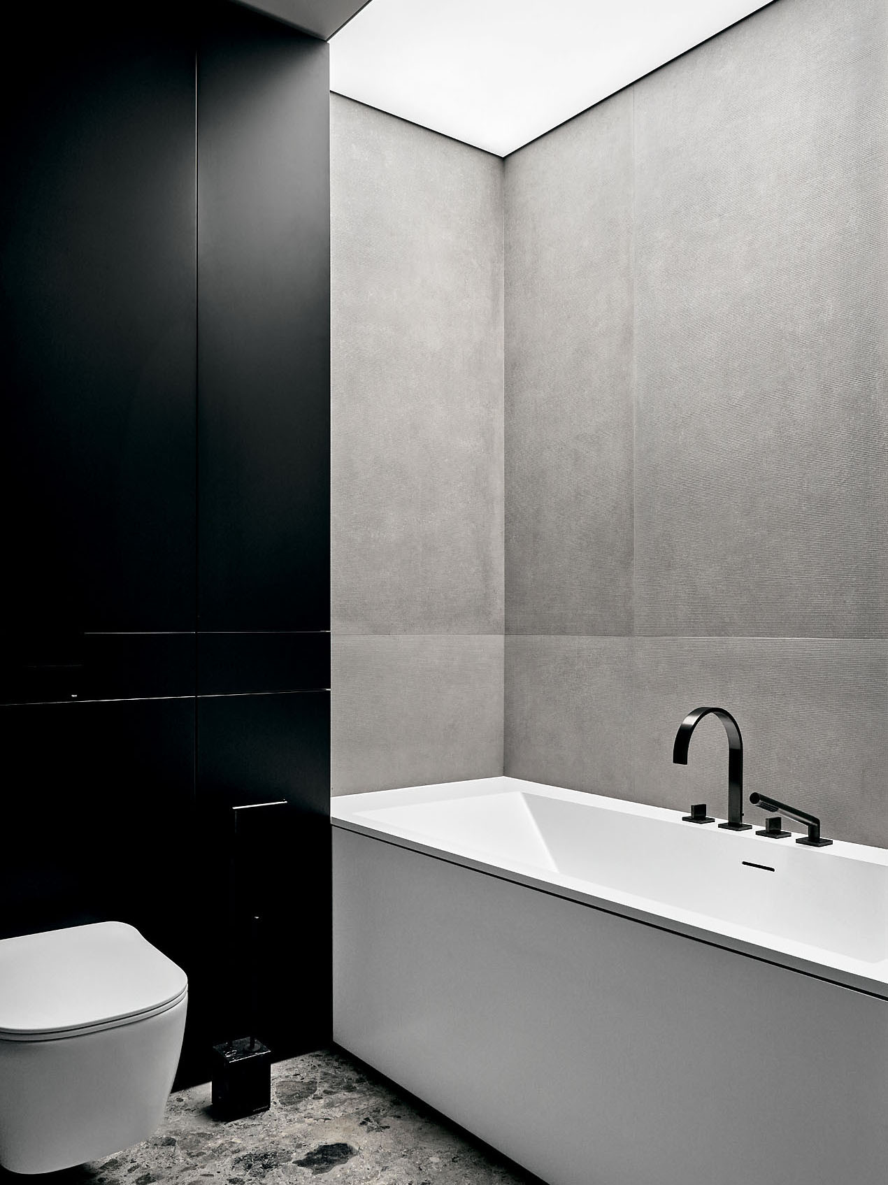 Ванная комната. Ванна из белого акрила, выполненная по индивидуальному заказу, элегантно встроена в нишу с отделкой вафельной плиткой под бетон от Cedit. По размеру ниши на потолке установлен лайтбокс. Интерьер дополнен смесителями Dornbracht, аксессуарами и унитазом Antonio Lupi. Помещение будет также использоваться хозяйкой для купания собаки