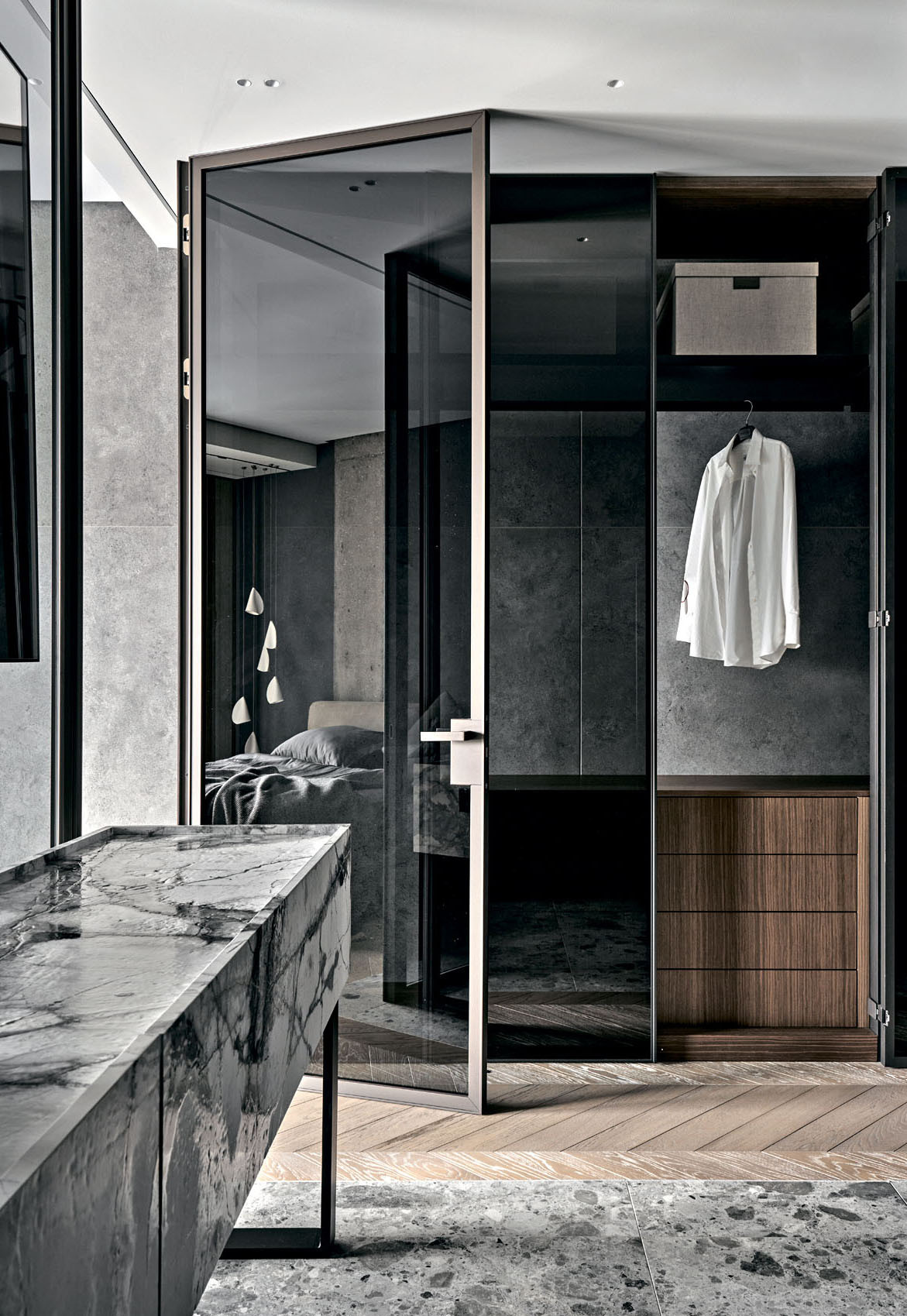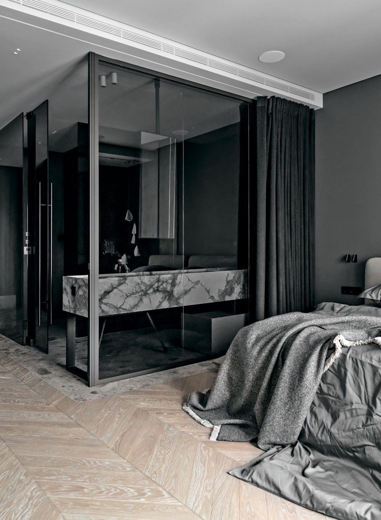 Высокие шкафы кухни продолжаются системой хранения приватного блока. Гардероб разделен на функциональные зоны: закрытое хранение за глухими фасадами, стеклянные витрины с комодами, открытые стойки для быстрого доступа и полки для обуви. Из гардероба мимо санузла можно попасть в спальню, а затем выйти в гостиную с другой стороны, вдоль окна