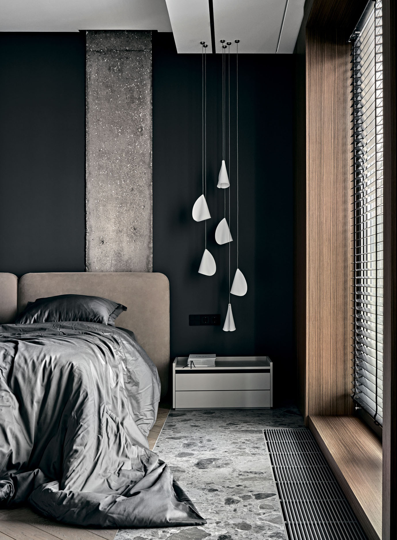 Фрагмент спальни. Основа композиции — замшевая кровать Minotti. Слева от нее расположен столик Baxter в теплом металле, справа — композиция с закрытой тумбой и фарфоровыми подвесными светильниками Bocci. Несущая колонна из бетона играет роль настенного панно и добавляет интерьеру характера