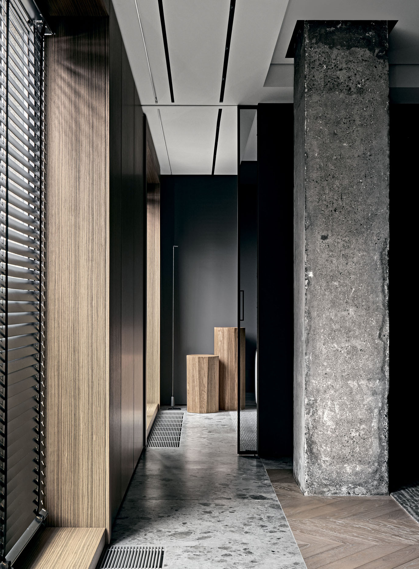 Изучив объект, команда студии предложила радикальный подход: полный редизайн для раскрытия потенциала пространства с помощью выверенных архитектурных приемов. «В нашей работе мы всегда ставим перед собой задачу гармонизировать пространство. Для нас важно использовать исходный потенциал объекта по максимуму, усилить его: разглядеть объем, который станет доминантой; материал, который можно сохранить; конструкцию, которая задаст ритм, — объясняет руководитель проекта Артур Митрошкин. — Основные визуальные инструменты, которые мы используем: пропорция, проекция, объем, свет, контраст. И результатом такой комбинации всегда становится интерьер, в котором человек чувствует себя больше, в котором хочется быть лучше». Неудивительно, что при таком глубоком подходе к работе заказчица прониклась доверием к профессионалам и согласилась начать проект с чистого листа.