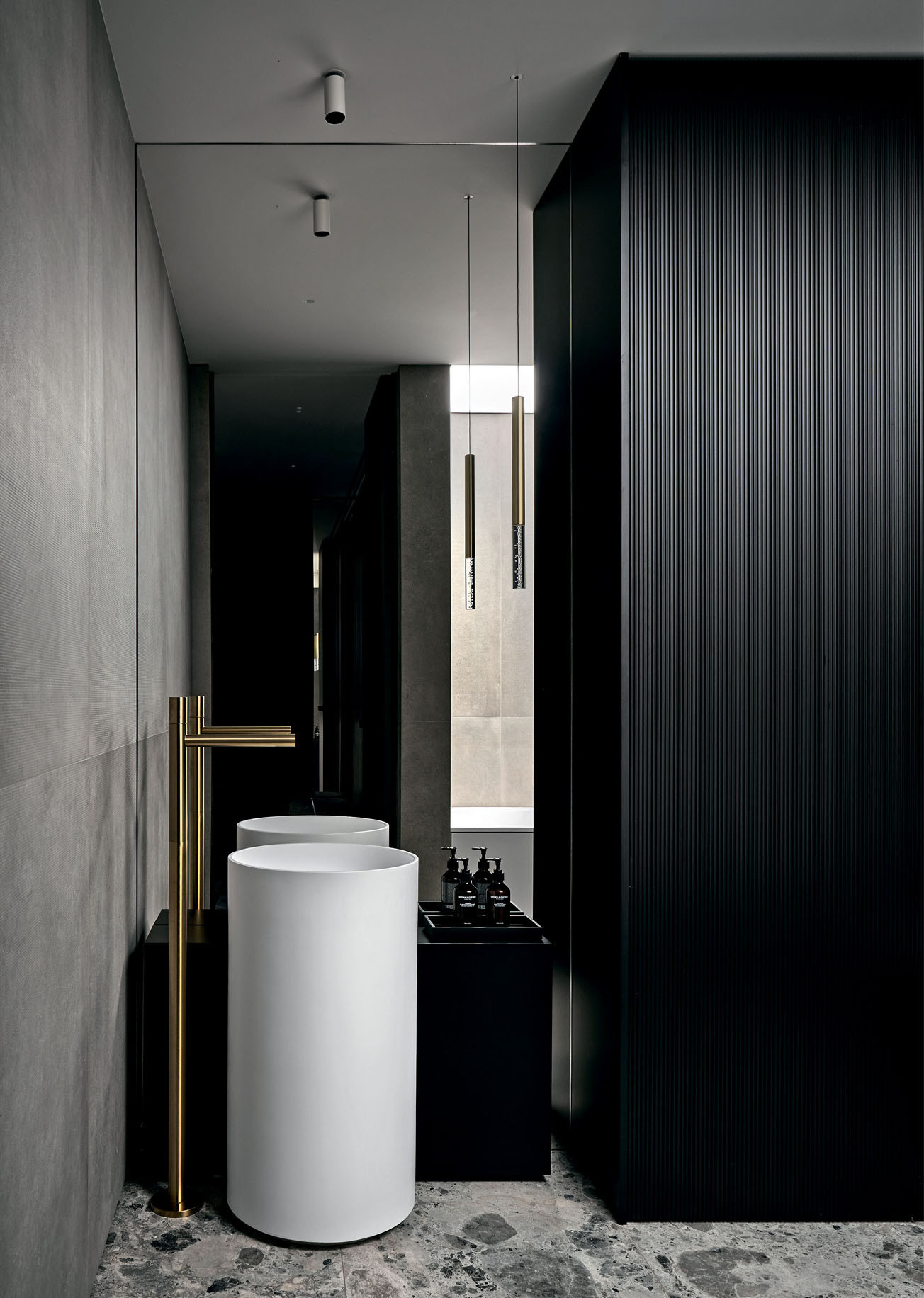 Вид на санузел. Парящая каменная консоль с раковиной и два двусторонних зеркала с подсветкой выполнены по чертежам авторов проекта. Пространство структурировано двумя стеклянными кабинами: тонированной полупрозрачной душевой и непрозрачным черным кубом для унитаза, обеспечивающим максимальную приватность. Смесители — Dornbracht, аксессуары и унитаз — Antonio Lupi, полотенцесушители — Cea