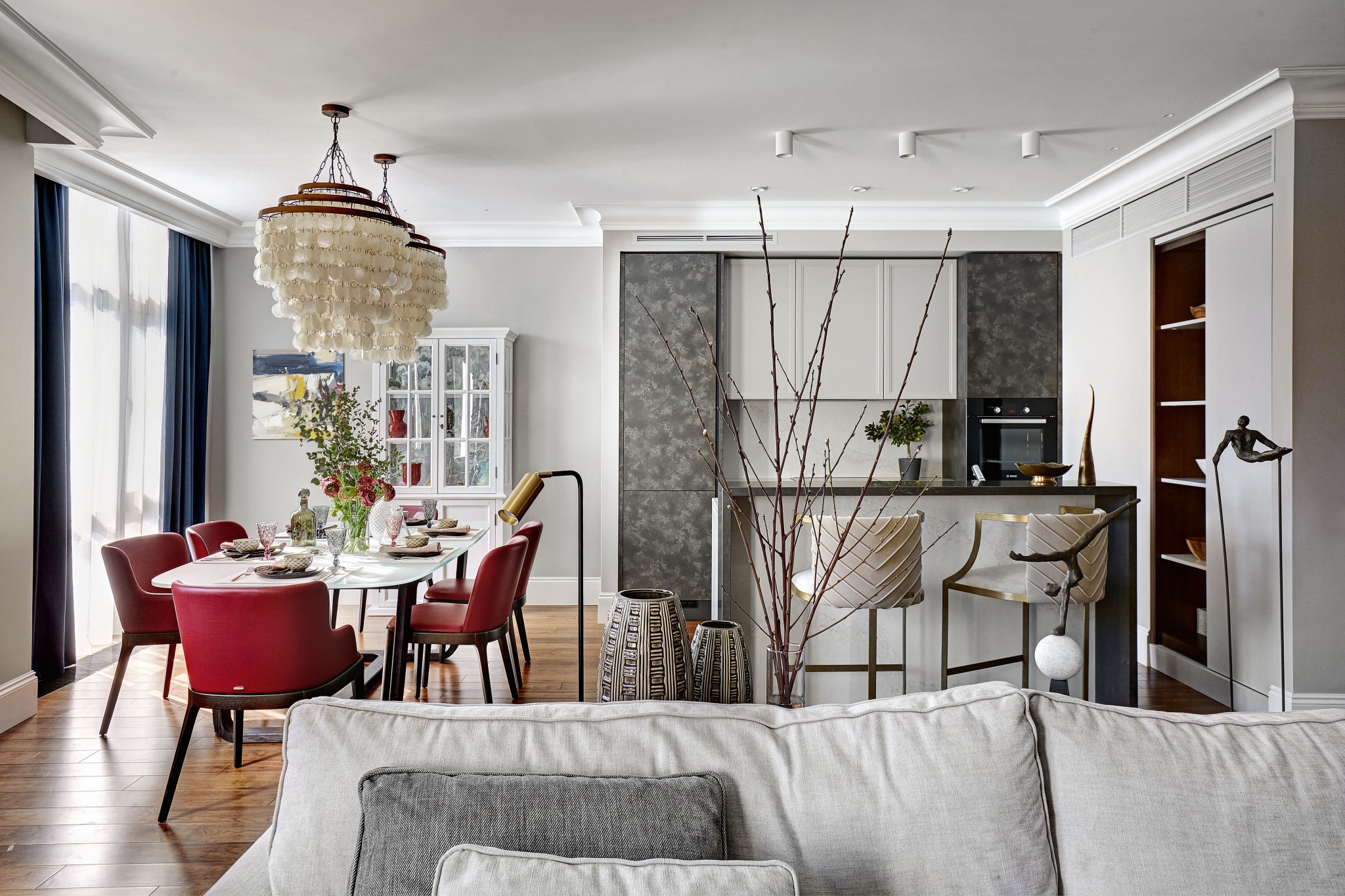 Супружеская пара приобрела четырёхкомнатную квартиру с отделкой, однако решила всё изменить в соответствии со своими представлениями об идеальном жилье. Нужны были и перепланировка, и стилистический апгрейд. «Изначально в квартире был очень длинный и узкий кабинет, которым никто не пользовался, — рассказывает Айя Лисова. — Мы решили снести перегородку между ним и другой комнатой и получили роскошное 40‑метровое пространство, в котором организовали гостиную, столовую и кухню». При этом две несущие колонны, которые выступали из гостиной в коридор, удалось визуально нивелировать, встроив между ними библиотеку. С тёмно–синими книжными шкафами и обоями с изображением облаков пространство коридора выглядит более гармонично: пейзажная «обманка» словно растворяет стены, а библиотека создаёт яркий акцент, сбивающий масштаб. Такими же обоями декорирована задняя стенка витрины, которая стоит в обеденной зоне. Белая витрина элегантно смотрится на фоне «французского серого» оттенка стены, кстати, идеального компаньона и для синих штор, и для красных стульев. Сочетание красного и сине‑ го в других условиях могло оказаться рискованным, но в данном случае правильный оттенок серого их уравновешивает.