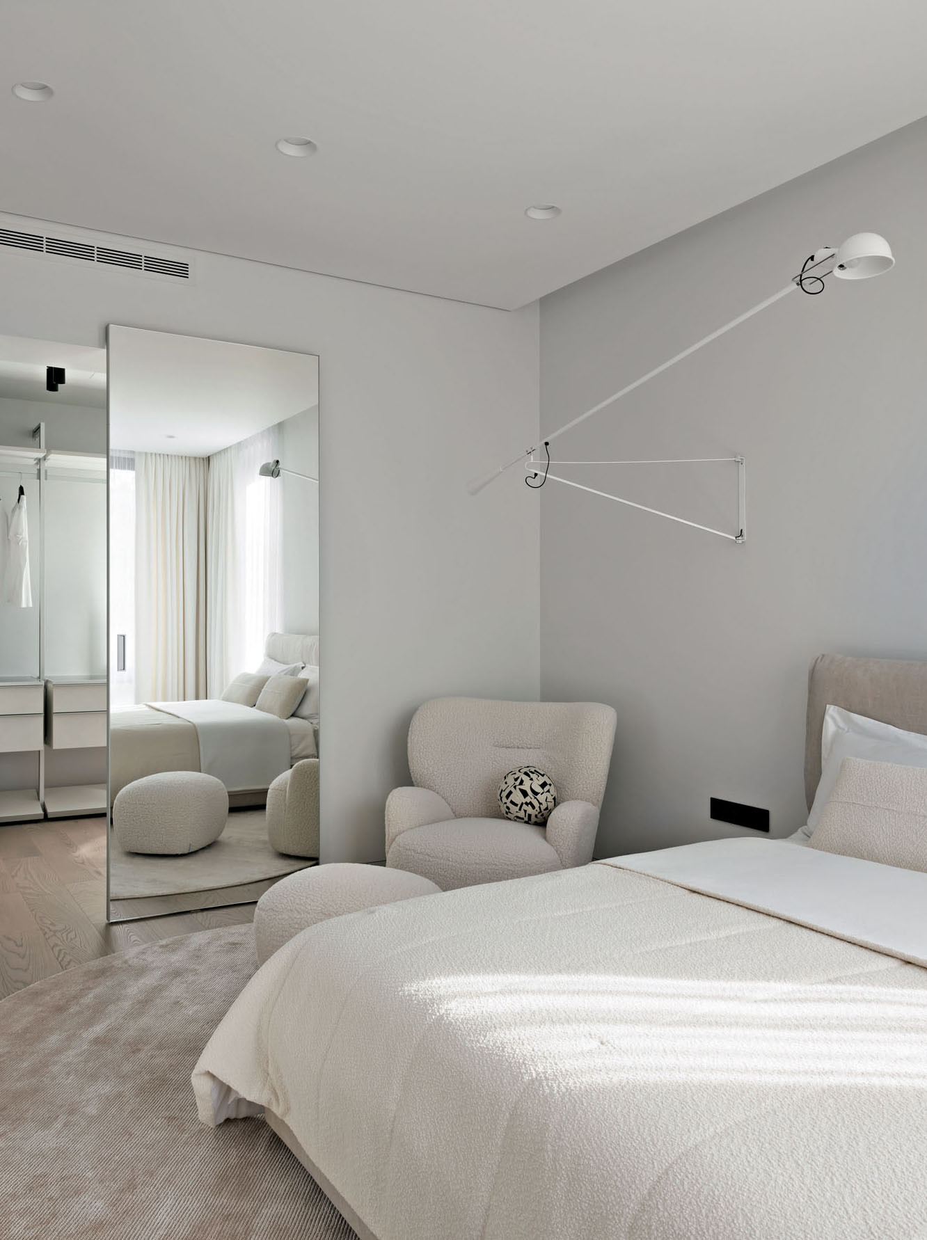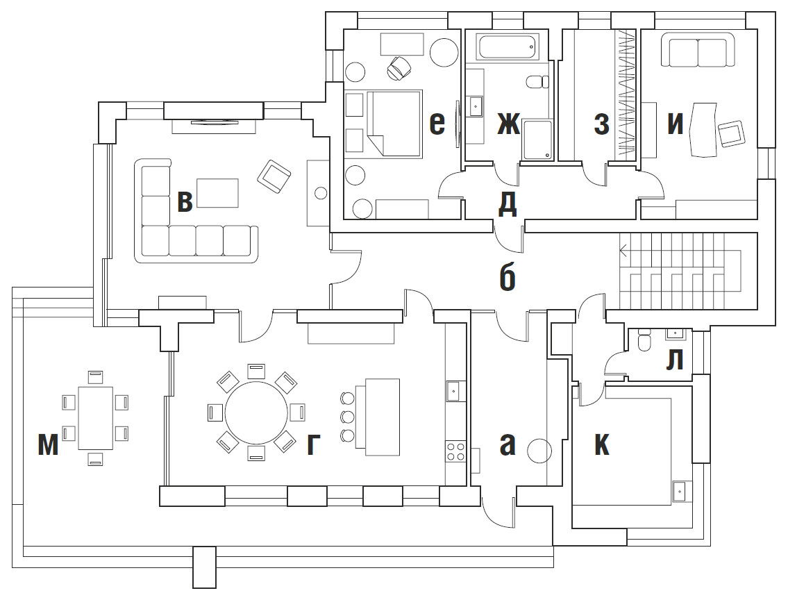Юлия Скачкова в своей работе придерживается принципов функционализма. «Я решила, что хочу максимально функциональный дом для двух взрослых и двух детей, — объясняет она. — Каждое решение должно иметь значимость и обоснование». Двухэтажный дом органично вписывается в ландшафт и с некоторых ракурсов выглядит одноэтажным. Такой эффект возникает из-за большой террасы на втором этаже и удаленности жилых зон второго этажа, которые как бы отодвинуты вглубь участка. Когда-то Юлия рассматривала одноэтажный дом — лаконичный, неброский, по-европейски скромный. Но дом в один этаж занял бы слишком много места на этом участке, а во-вторых, хотелось сделать планировку компактной, без лишних коридоров. Поэтому часть комнат архитектор «увела» на второй этаж: там расположены детская спальня с санузлом и гардеробной от ALF DAFRE, а еще тренажерный зал, который, если понадобится, легко переформатировать во вторую детскую. На первом этаже — гостиная, кухня-столовая, главная спальня и кабинет.