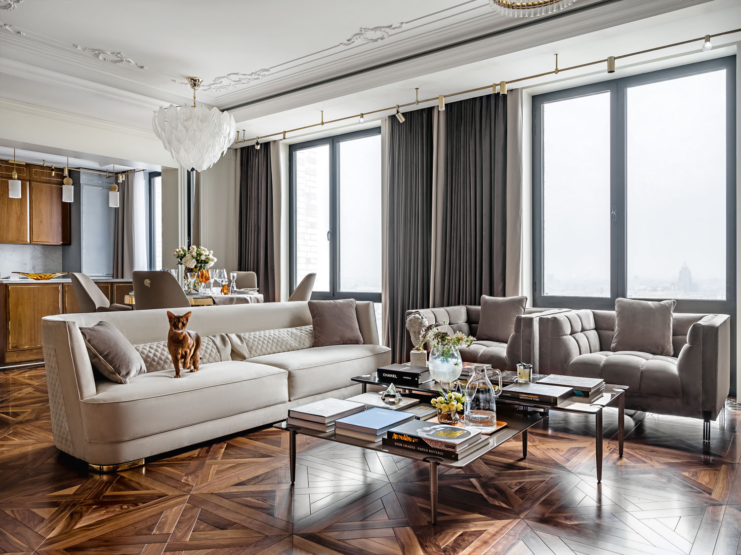 Заказчик приобрёл две квартиры в новом жилом комплексе в центральном округе столицы. Проект этого многофункционального комплекса бизнес–класса разработан архитектурным бюро Speech и помимо основных жилых пространств в высотных зданиях включает в себя обширную инфраструктуру — просторные дизайнерские фойе, подземные парковки, магазины, кафе, выставочное пространство, а также различные сервисные службы. «При первой встрече заказчик передал ключи от двух квартир, которые нам необходимо было превратить в один объект. В жилом комплексе изначально не предполагались квартиры большой площади, но возможность объединить небольшие квартиры между собой была, — рассказывает архитектор Анна Комлева. — С этим заказчиком мы работаем не в первый раз, и определённый кредит доверия уже был, но в этом проекте он стал безграничным: нам передали ключи на объекте, прислали несколько референсов консервативного классического стиля, мы обговорили ориентировочный бюджет и начали работать. Такая уверенность заказчика в нашем профессионализме одновременно приятна и очень волнительна, потому что полная ответственность лежит на архитекторе — нужно не только качественно выполнить свою работу, но и предугадать пожелания клиента»