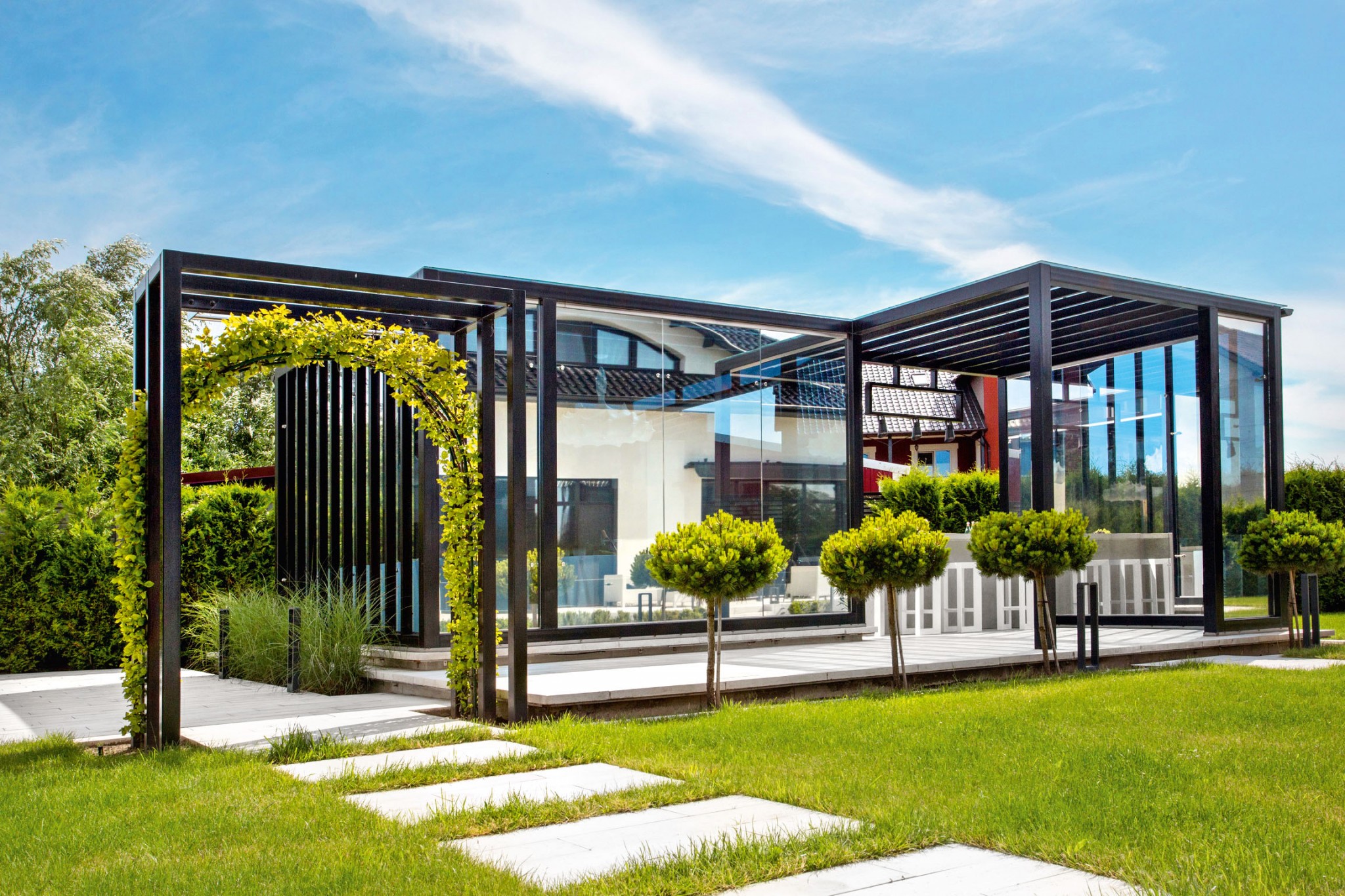 Для зоны отдыха в частном доме в Калининграде Алёна Чашкина возвела модернистский павильон, органично вписанный в ландшафт