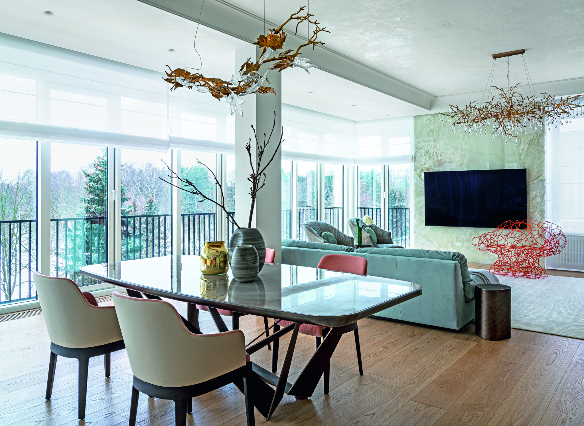 Квартира расположена в одном из центральных районов Санкт–Петербурга, в окружении природного парка. Владельцы — семейная пара с двумя детьми— любят отдыхать в зимних Альпах, им нравится единение с природой и ощущение простора. Поэтому они по достоинству оценили образ «спокойствия, чистоты и свежести, дарящие комфорт», который предложили авторы проекта Мария Махонина и Александра Казаковцева в качестве ведущей темы оформления. Двухсотметровое пространство с большим объёмом остекления и живописными видами действительно обязывало и предопределило многие решения, в том числе и функциональные. Чтобы сохранить эффект объёма, света и воздуха, акцент сделали на перетекающем принципе организации. Так, входная группа представляет собой фактически единый объём с зоной гостиной–кухни–столовой за счёт отсутствия видимых перегородок. А ещё архитекторы намеренно отказались от отдельных гардеробных, дабы не уменьшать площадь спален (хозяйской и двух детских), и оборудовали системы хранения внутри самих помещений.